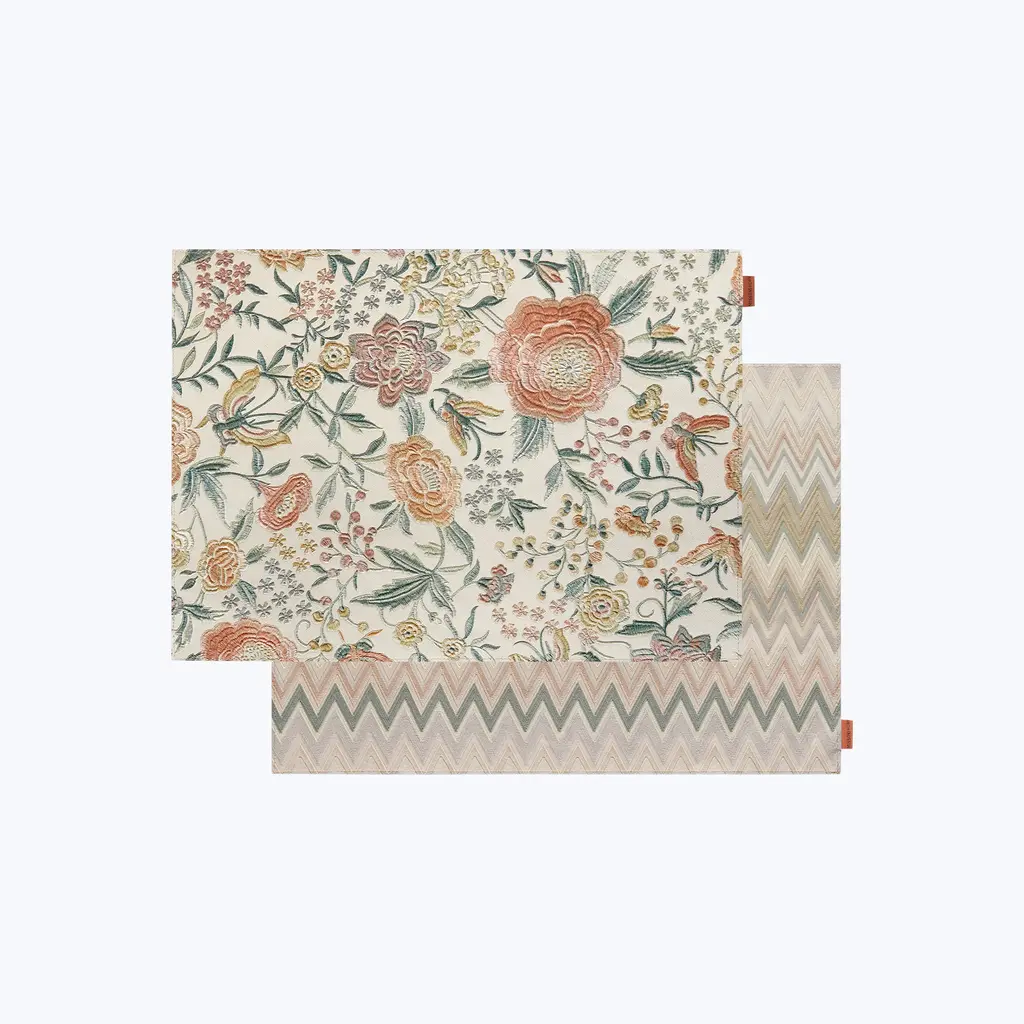 Dress up your tablescape with this set of two double-sided Floral Patterned Paper Placemats. Featuring one side with an intricate floral design and the other with a classic Missoni zigzag chevron motif, this placemat set is a beautiful addition to your next dinner party or everyday dining experience. Made in Italy from a fabric-like paper that can be cleaned with a damp cloth.