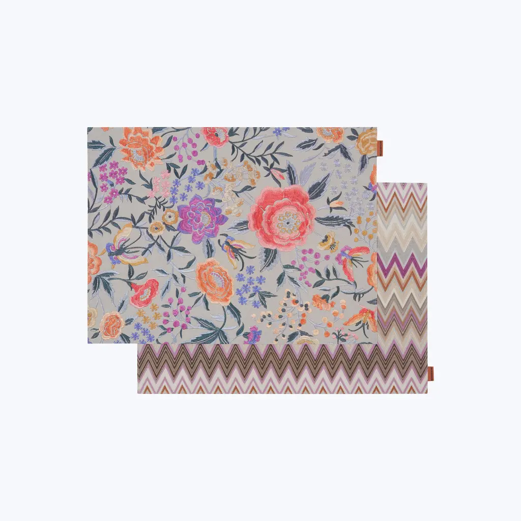 Dress up your tablescape with this set of two double-sided Floral Patterned Paper Placemats. Featuring one side with an intricate floral design and the other with a classic Missoni zigzag chevron motif, this placemat set is a beautiful addition to your next dinner party or everyday dining experience. Made in Italy from a fabric-like paper that can be cleaned with a damp cloth.