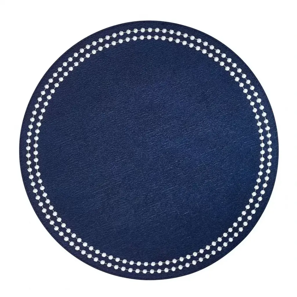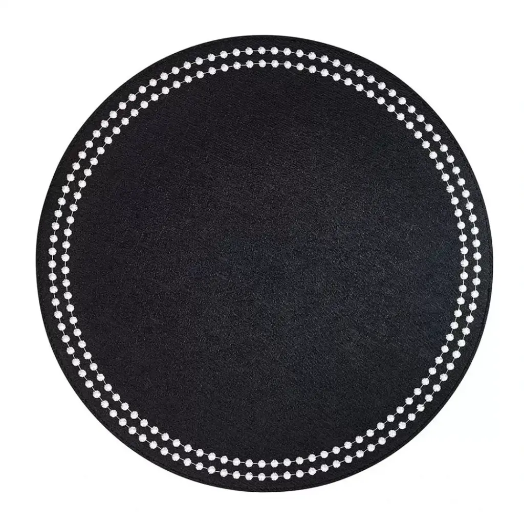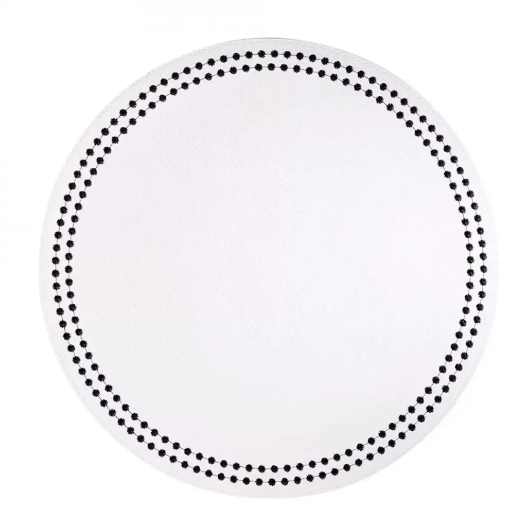 Round mats with pearl-like embroidered dots aRound the edge. Available in multiple colors.