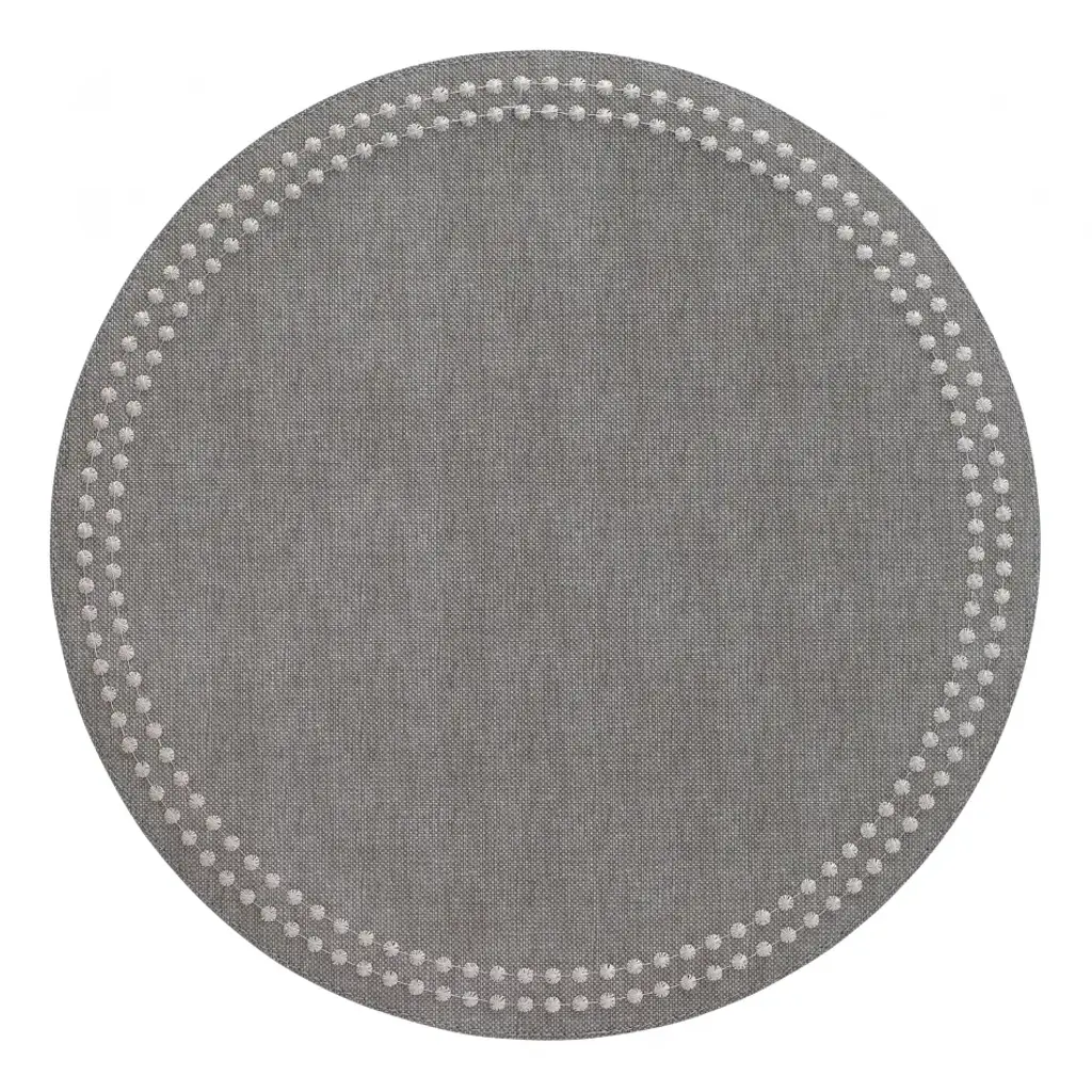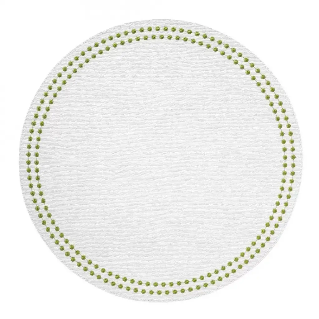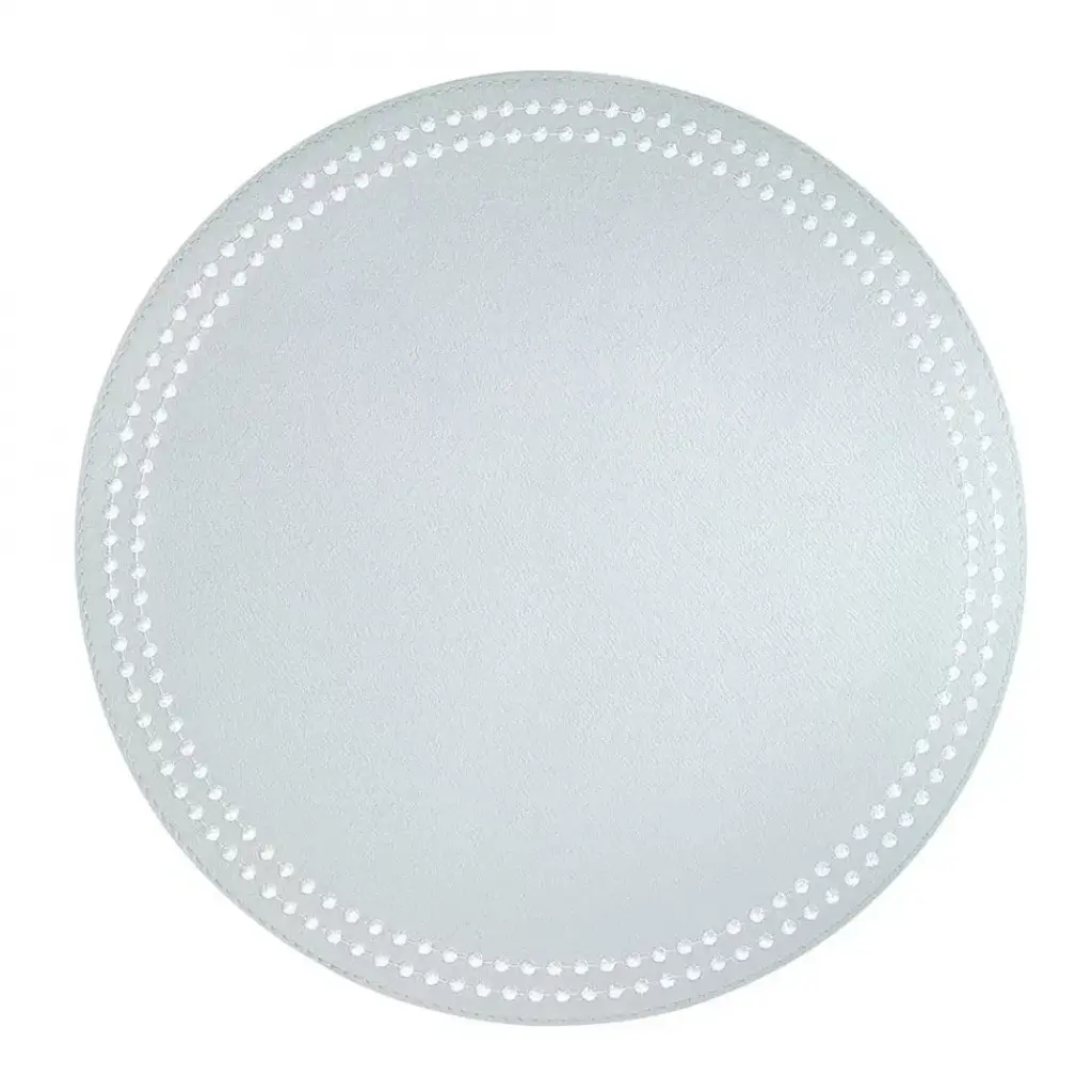 Round mats with pearl-like embroidered dots aRound the edge. Available in multiple colors.