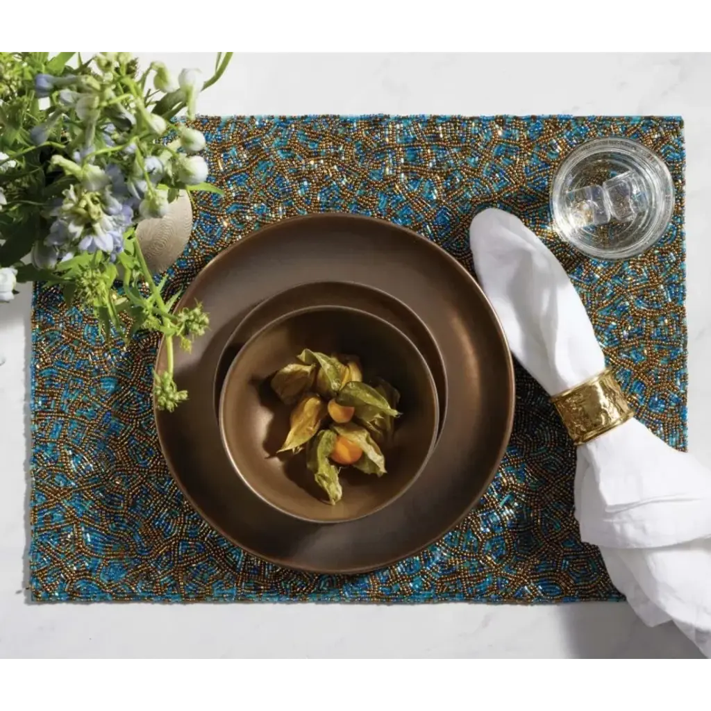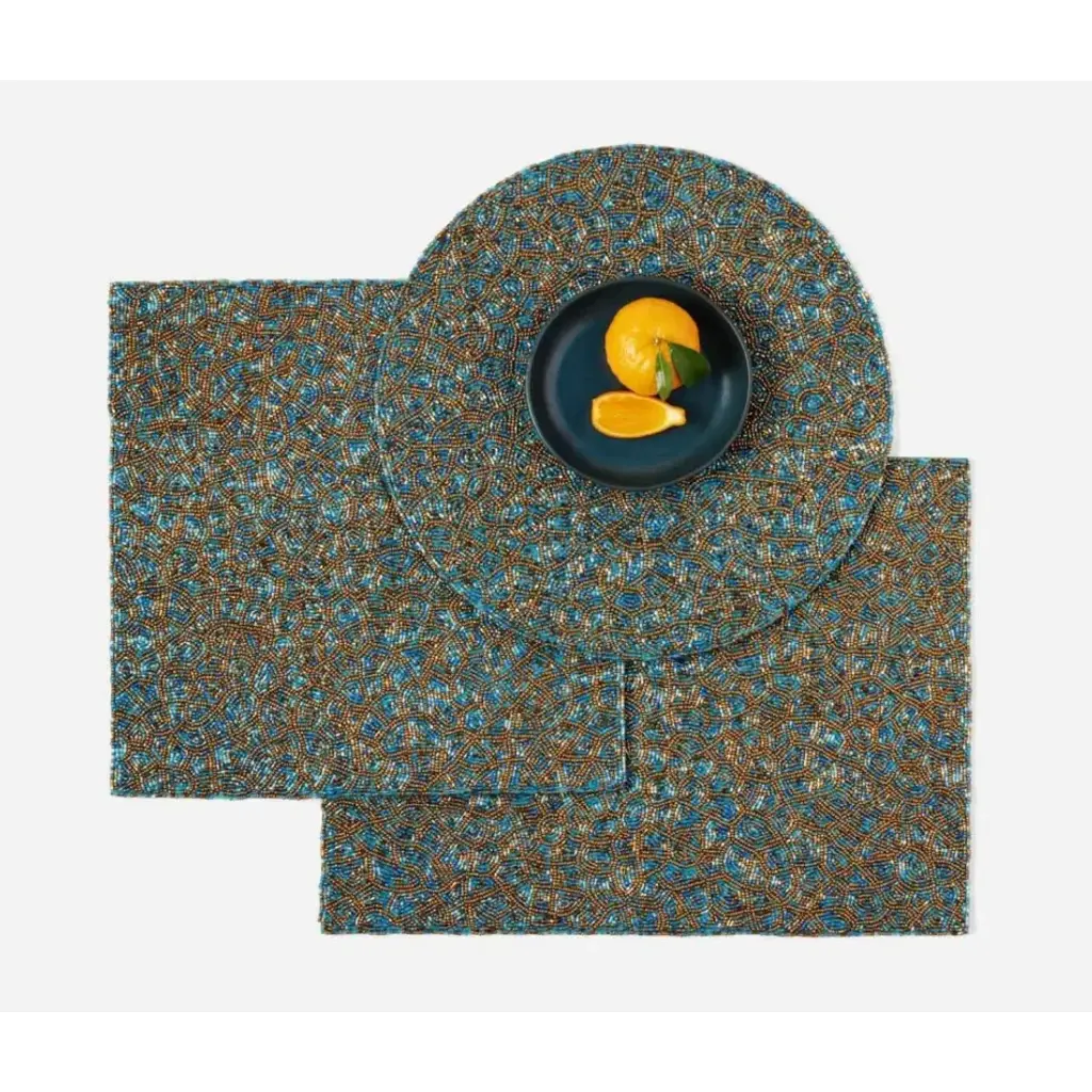 Finish: Turquoise Gold Mix Material: Glass Beads Our Phoebe placemat set is adorned with strands of light-catching gold and turquoise glass beads that lend a sun-dappled quality to any gathering. Blue Pheasant's products are handmade with care by artisans using natural materials. They are not mass produced, so variation between products should be expected, and this is why we love them! It is these irregularities that makes Blue Pheasant what it is—a special brand whose collections are distinctly handmade, full of charm and originality you’ll never find in machine-made products.