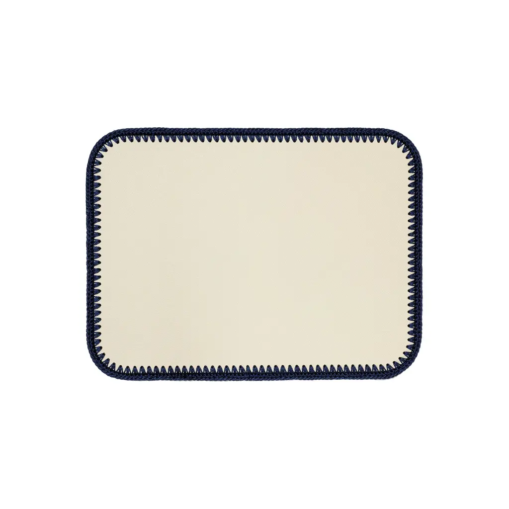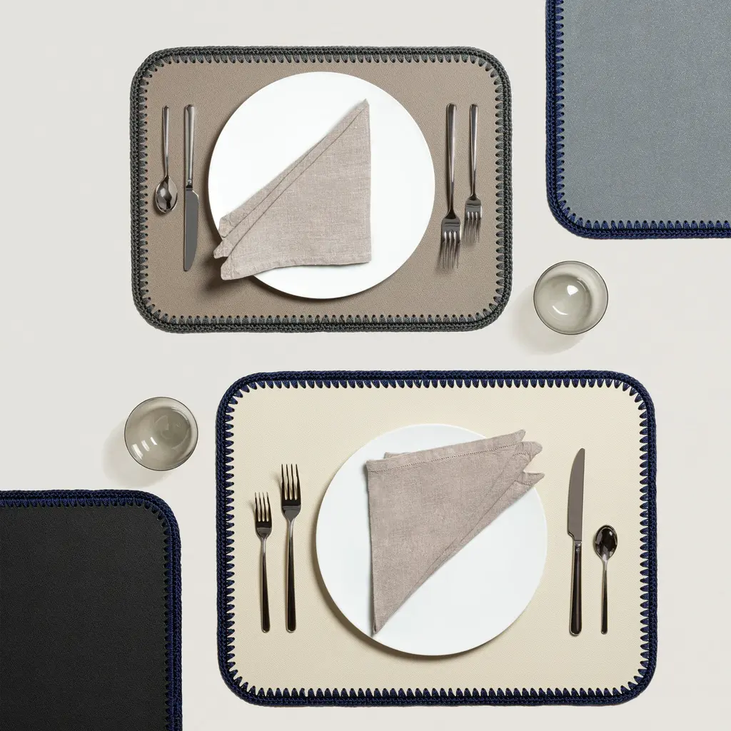 A masterful blend of clean lines and artisanal texture, the Pigment France Rochelle Rectangular Placemat is a sophisticated design from Giobagnara and Pigment France. Expertly handcrafted in Italy, each piece features a fine leather center framed by a refined, handwoven passementerie edge. This rich combination of textures offers surprising durability, making it ideal for both elegant indoor tablescapes and stylish alfresco meals. It's a timeless foundation for any memorable dining occasion. Highlights: