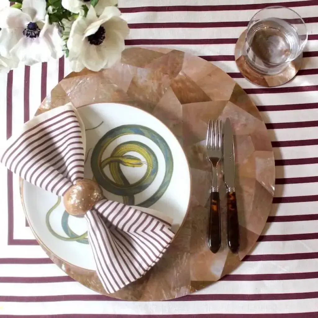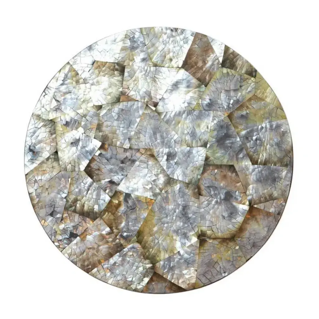 Cracked and layered shells form an eye-catching intricate design in our Pearl Placemats. The variation of natural texture and pattern brings an intriguing dimension to these modern and unique placemats. Shells in a gorgeous variety of warm hues—rose, blush, cream, white, and beige—are laid out in a geometric design. A full spectrum of colors found in nature—blue, grey, green, black, gold, and silver—are all part of this kaleidoscope of color and pattern. Available in three colors.
