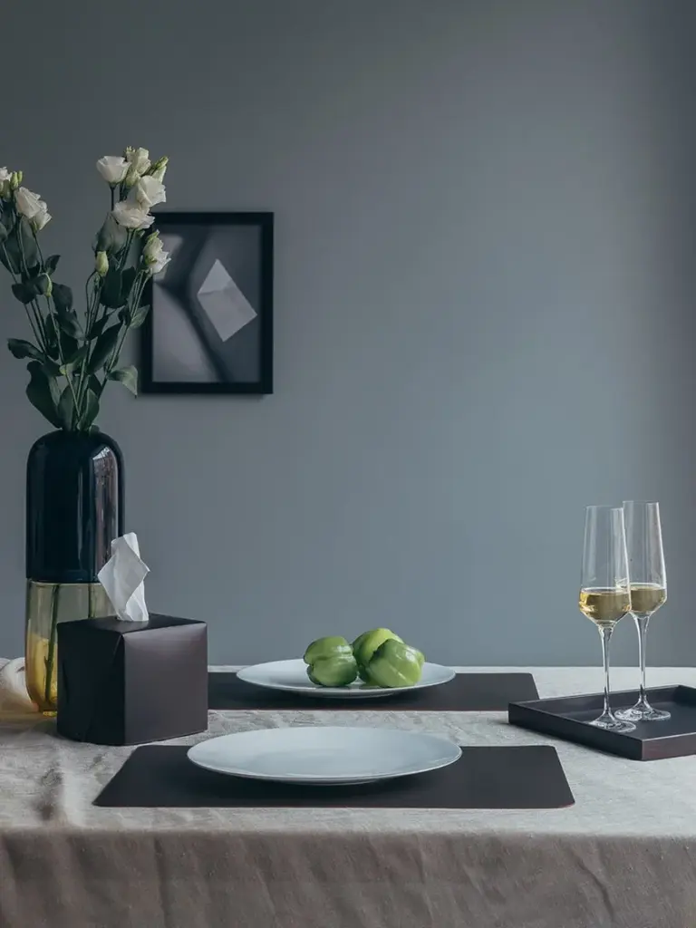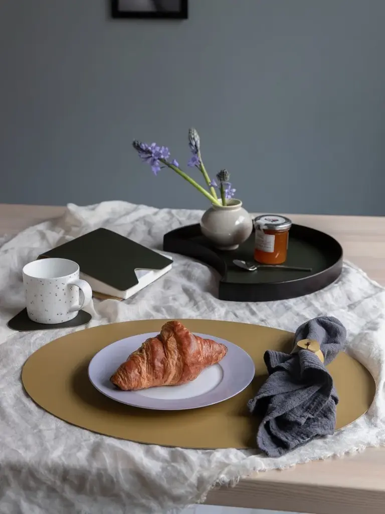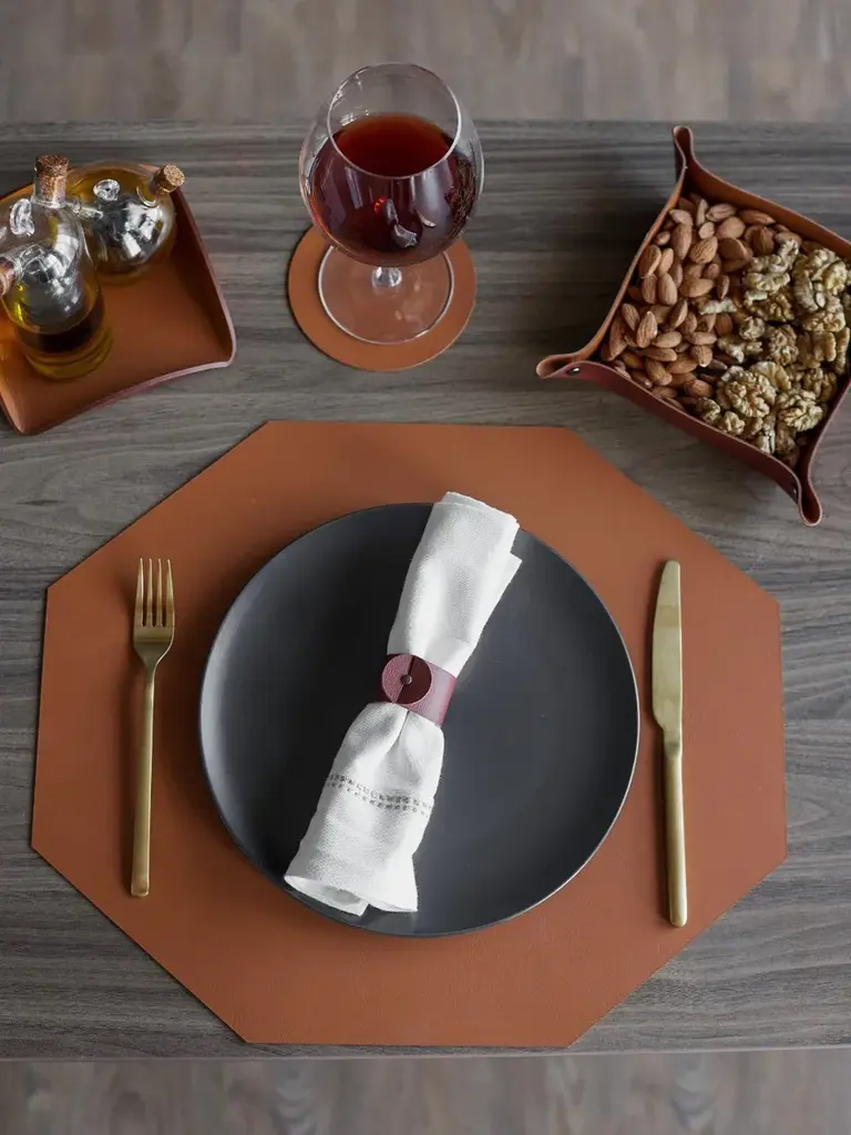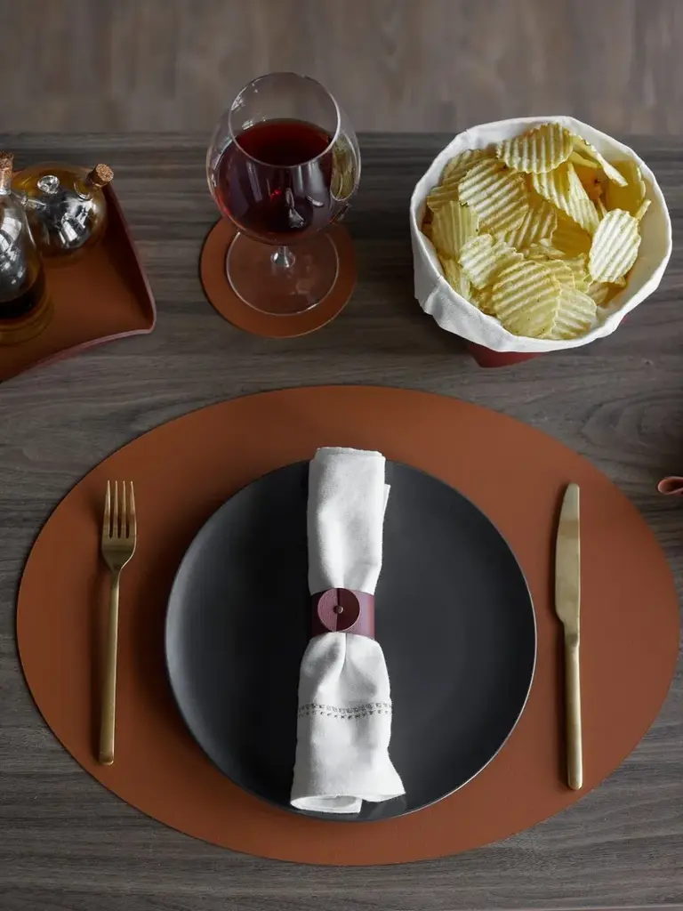 Convenient, practical and aesthetic placemat is an alternative to traditional table setting with a table-cloth. Two-sided leather dyeing expands the range of colors for the table setting, and water-repellent treatment protects against staining by oil, vinegar and sauces. Each product utilizes ADJ's multifunctional leather, which undergoes double-sided dyeing and a specialized anti-vandal treatment, resulting in enhanced durability against wear, scratches, and abrasions.