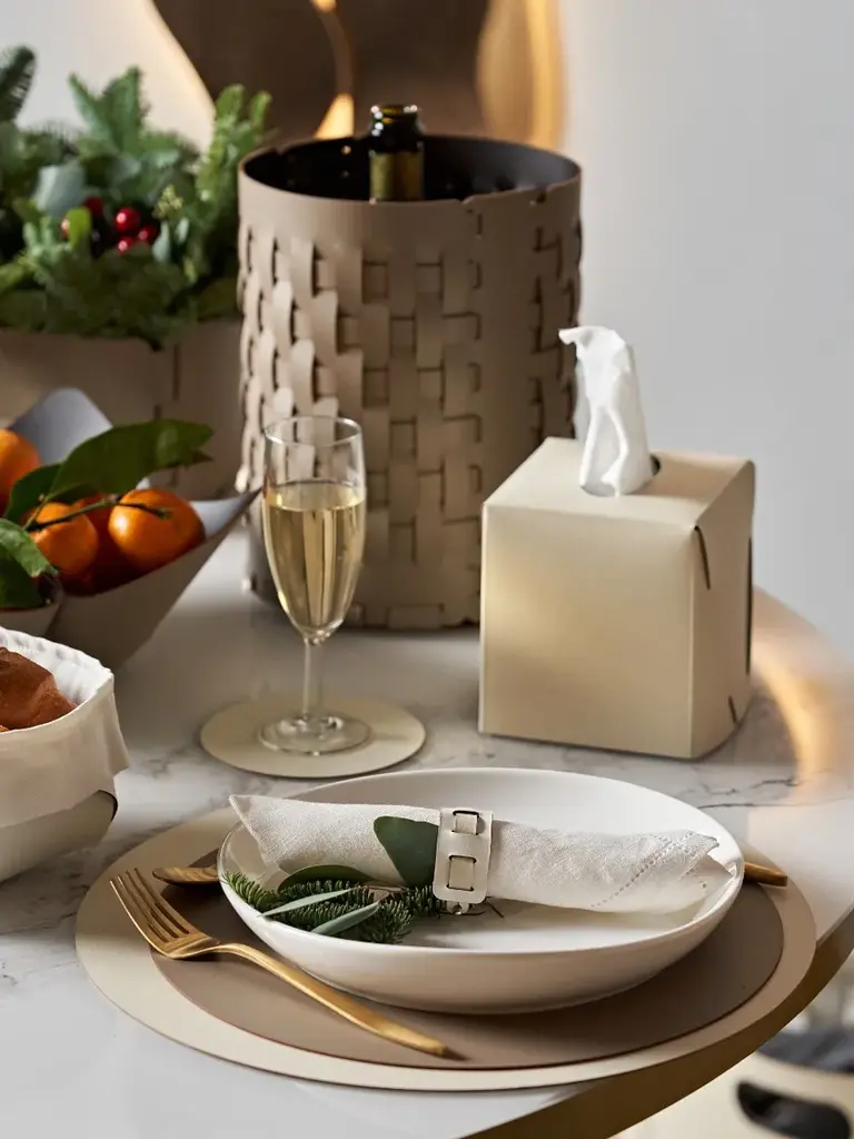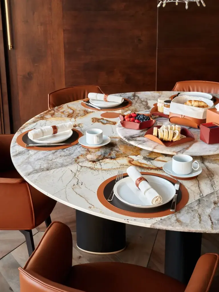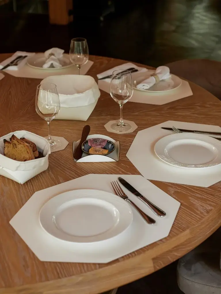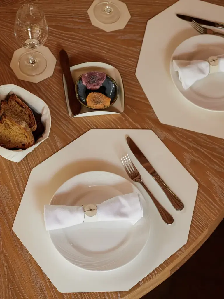 Convenient, practical and aesthetic placemat is an alternative to traditional table setting with a table-cloth. Two-sided leather dyeing expands the range of colors for the table setting, and water-repellent treatment protects against staining by oil, vinegar and sauces. Each product utilizes ADJ's multifunctional leather, which undergoes double-sided dyeing and a specialized anti-vandal treatment, resulting in enhanced durability against wear, scratches, and abrasions.