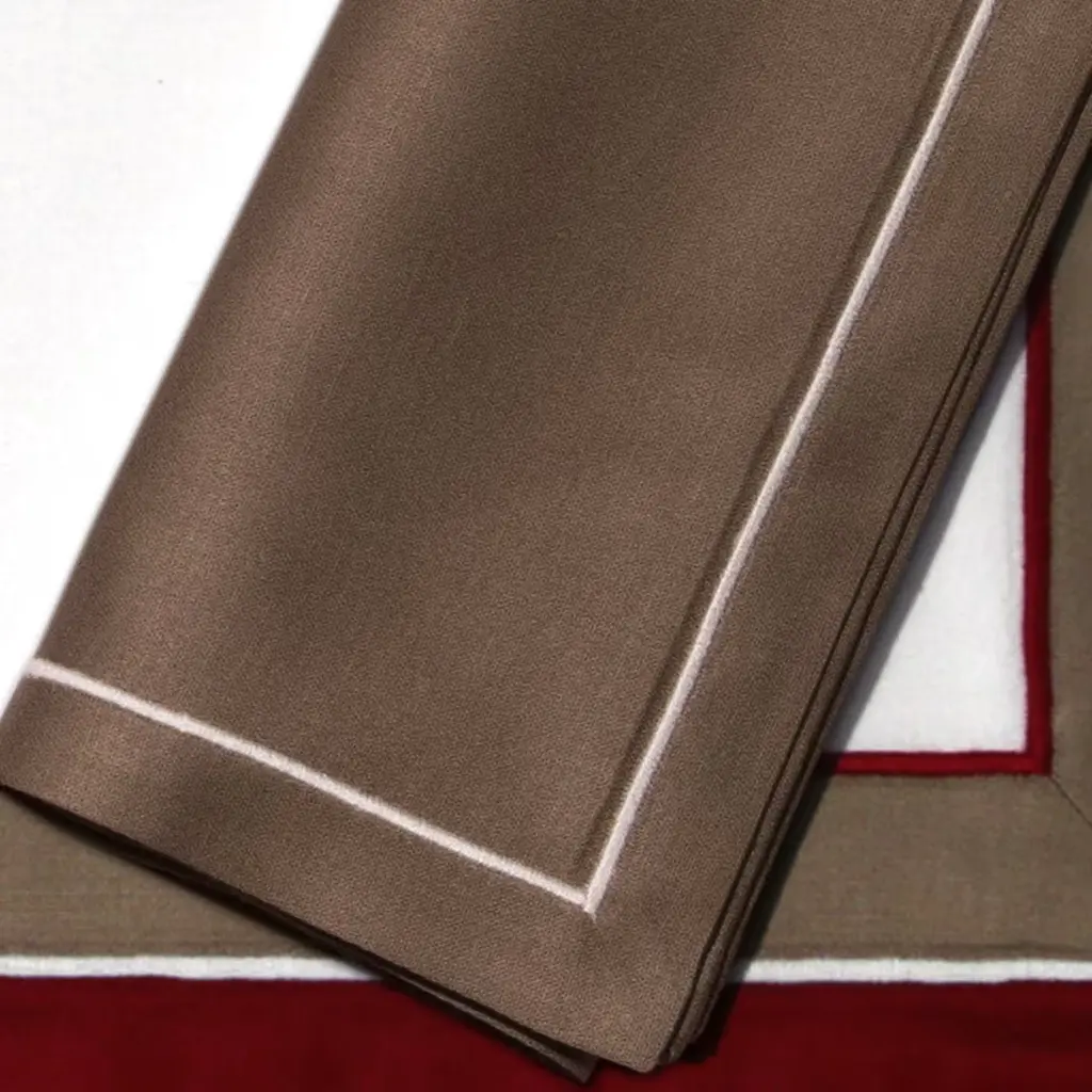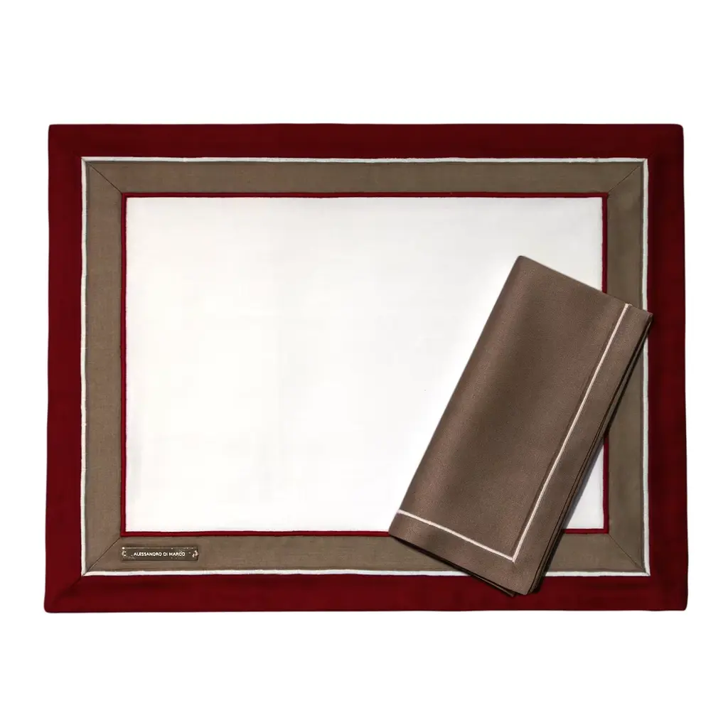 This delightful place setting includes two fine cotton placemats in White with a Beige and Red cotton frame. Two attractive napkins accompany the set in beige cotton with Dark Brown embroidery. Metal logo plate has been embossed and sports an 18K gold finish.