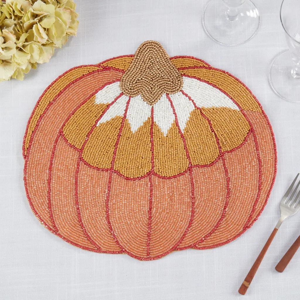 The Beaded Pumpkin Placemats are a great choice when it comes to setting your Thanksgiving table, but can also be used throughout the fall. They bring a whimsical note to any tabletop. Pair with matching runner.