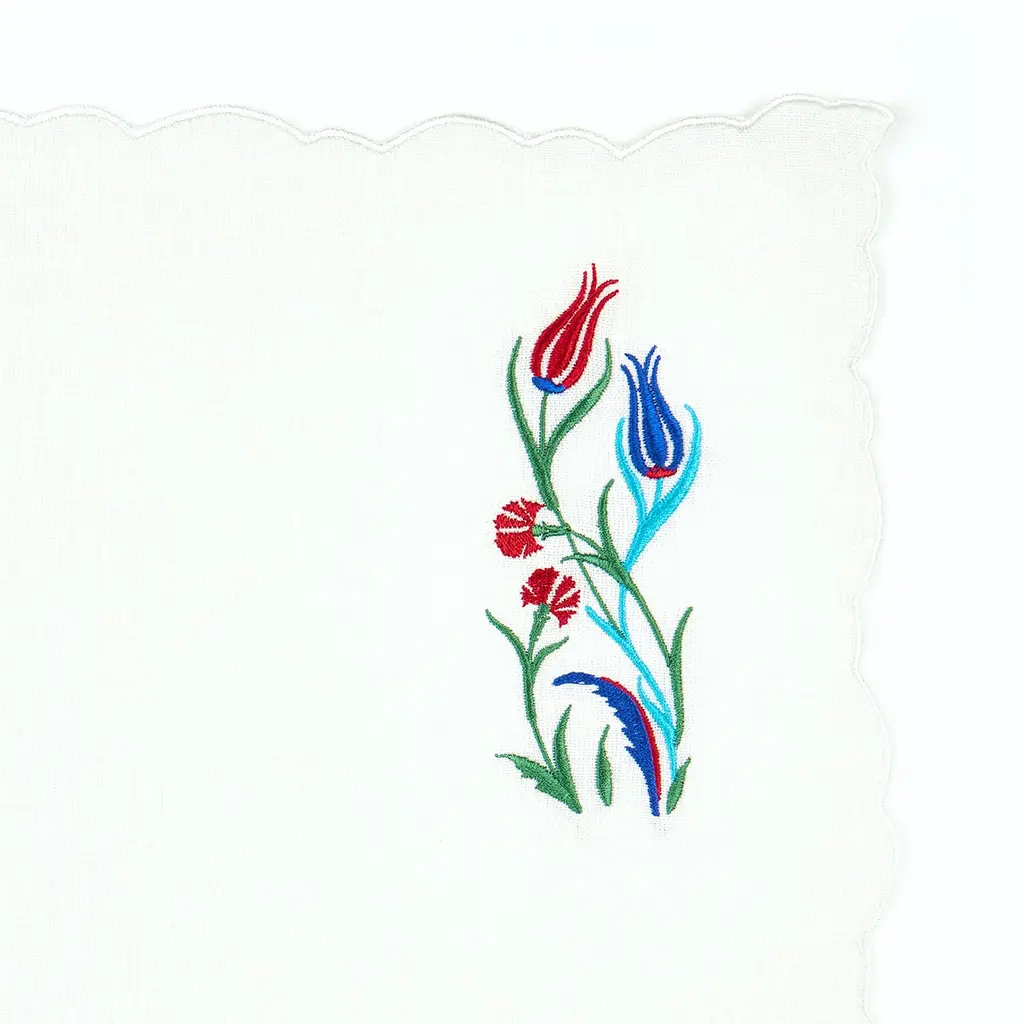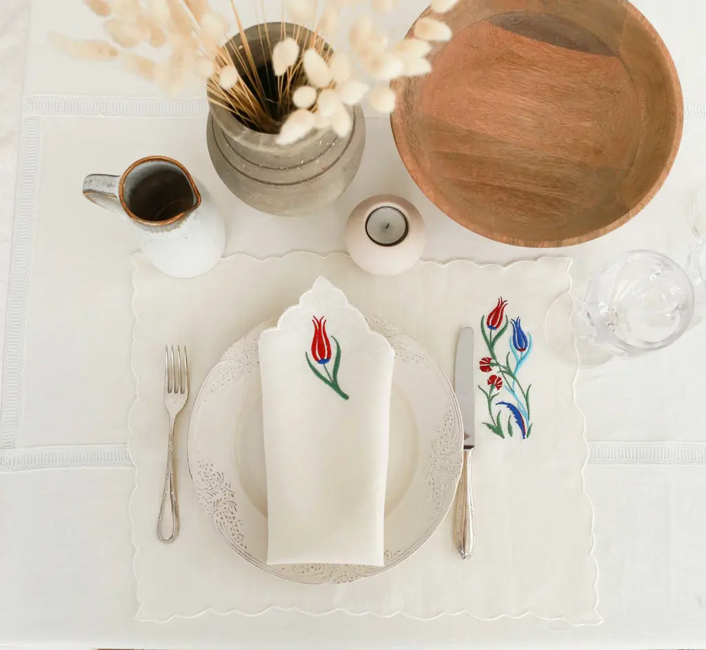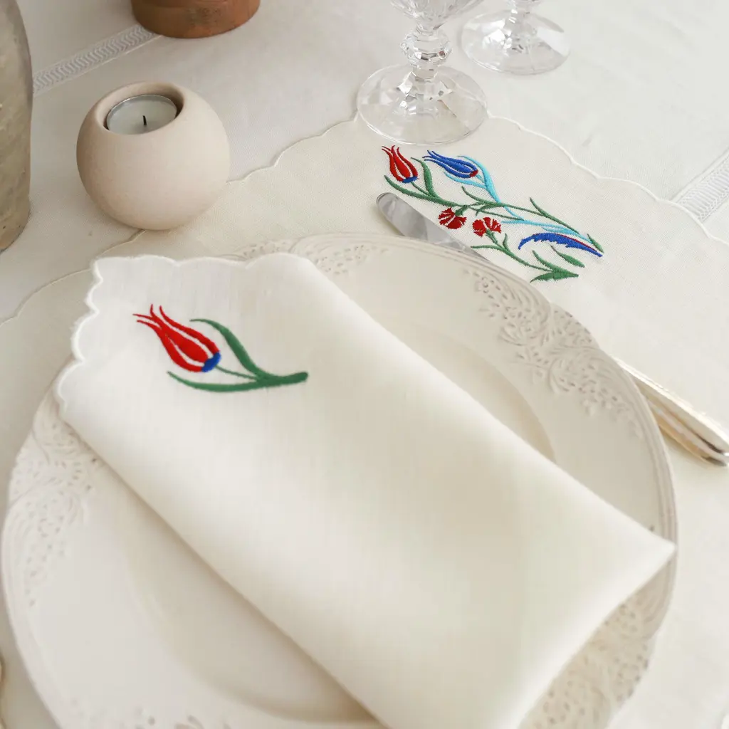 These elegant and stylish handmade embroidery placemats will bring elegance to your table.Set of 2These red and blue tulips embroidery placemats are made of 100% Turkish linen and the design is inspired by history of the Ottoman Empire. These beautiful placemats will definitely shine on your table and present an unforgettable experience for your guests.