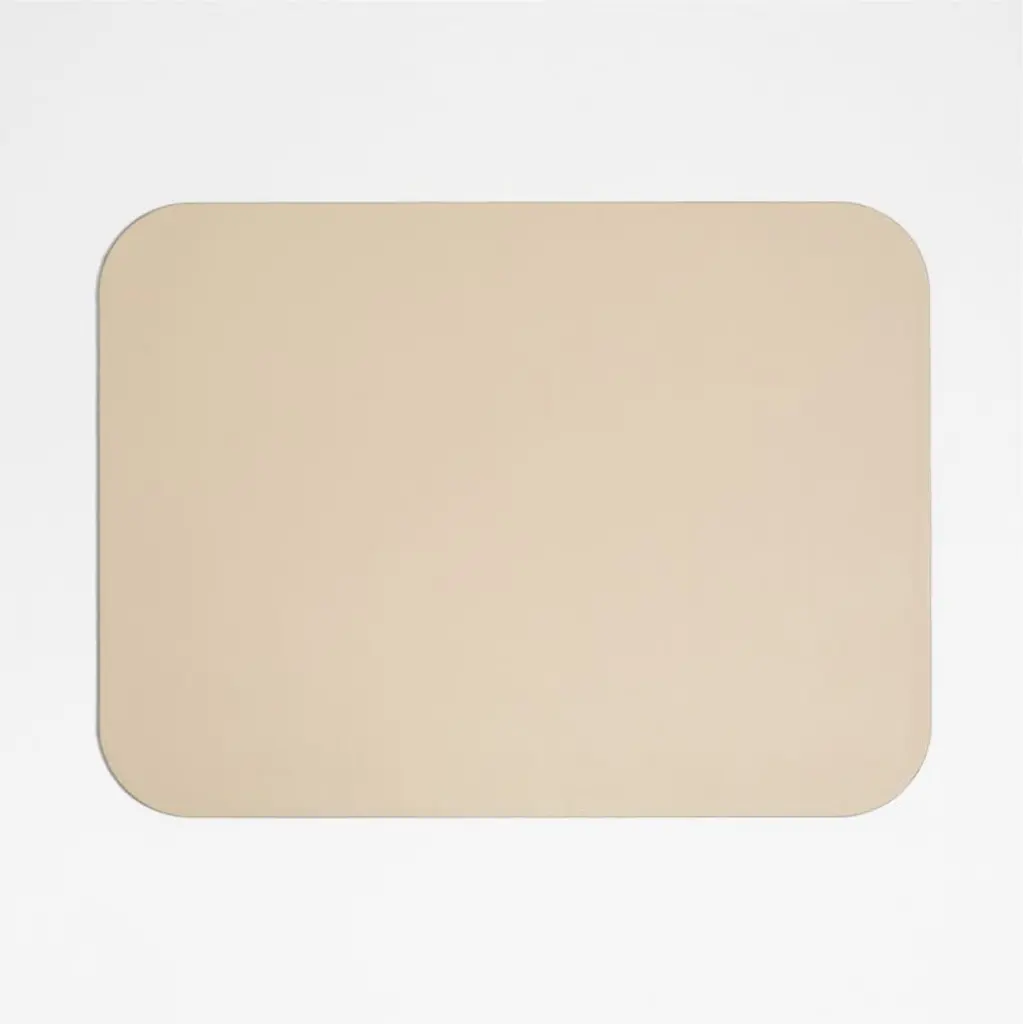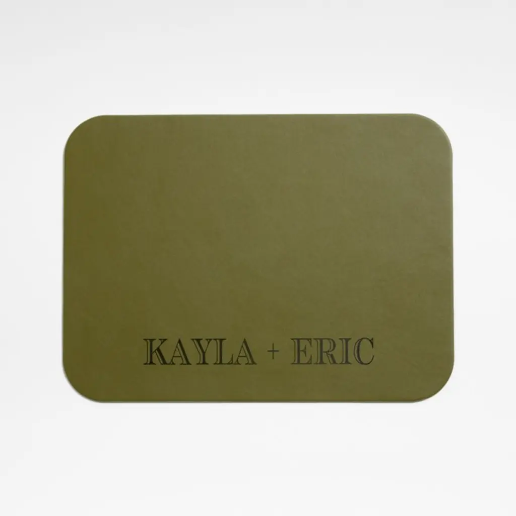 Our Rizzo rectangular placemat replicates the luxe look of leather. Tinted olive green and flipping to beige, the double-sided placemat sets a sophisticated and table-saving foundation for any place setting. Made of responsibly sourced materials, the Rizzo faux leather placemat is a Crate & Barrel exclusive.