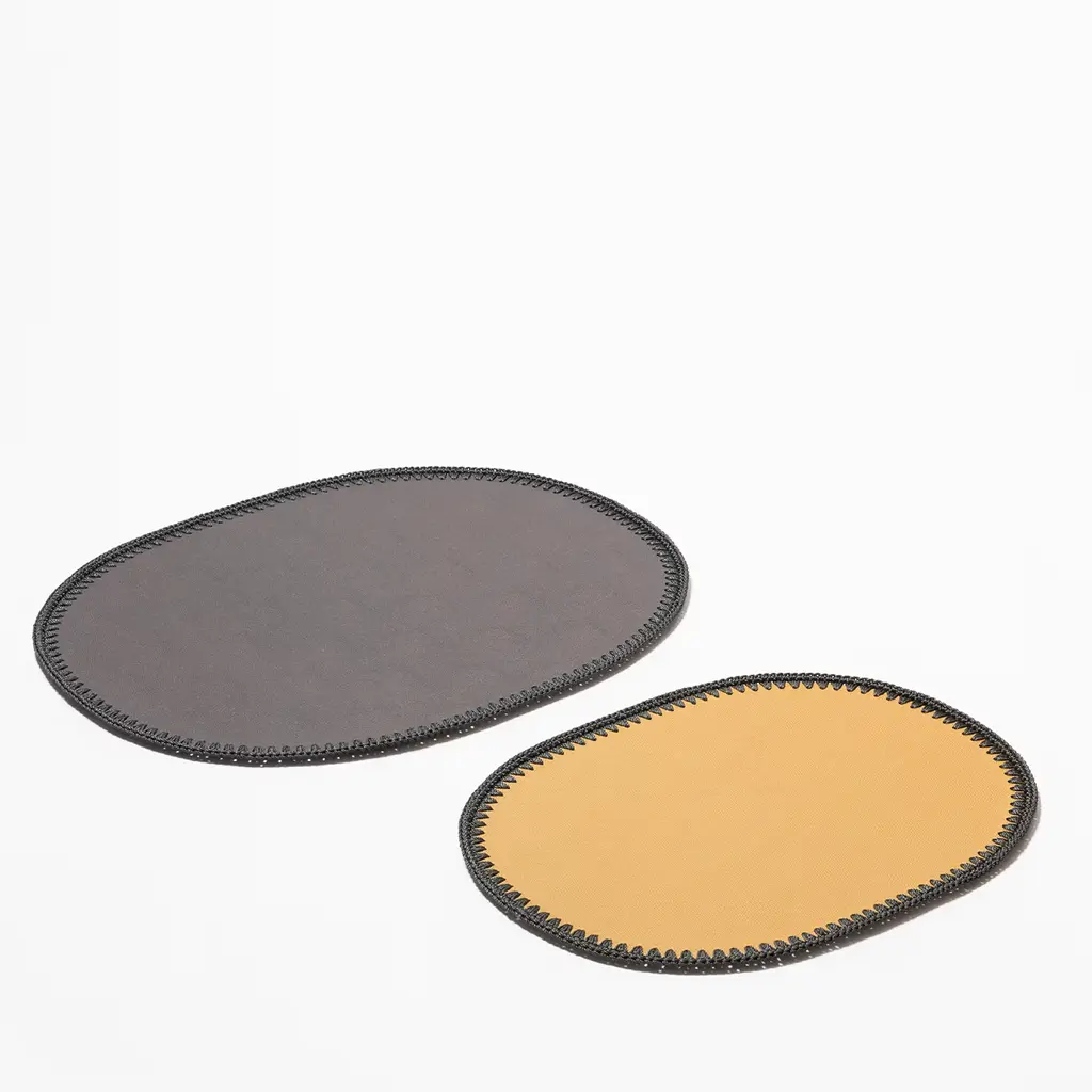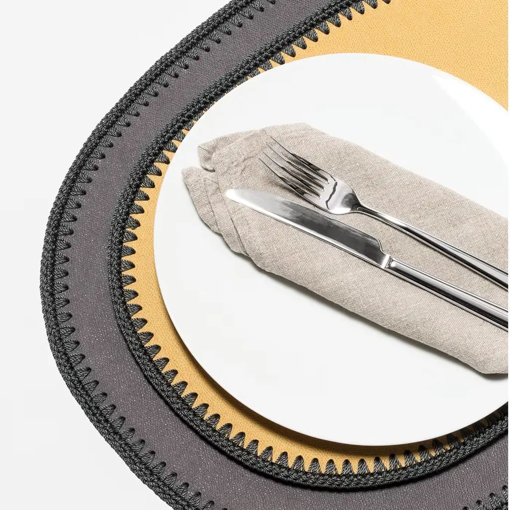 The Rochelle collection of coasters and placemats features the vibrant combination of a fine leather center and a refined hand-woven trimming edge. This collection is ideal for year-round dining indoors or outdoors and requires simple care: wipe clean with a sponge or cloth.