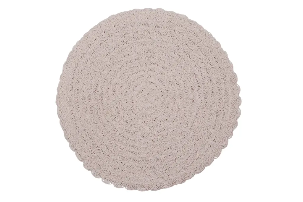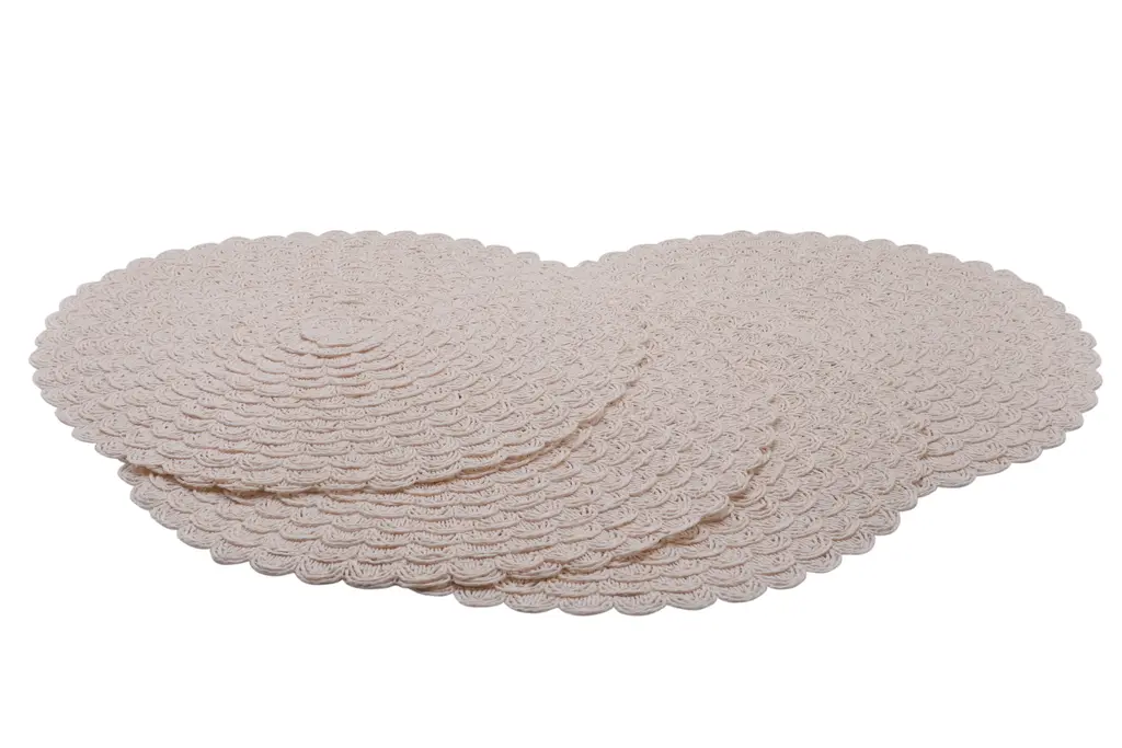 A set of four round crocheted placemats in pink. Woven in a spiral pattern finished with a scalloped edge. Dimensions per placemat.