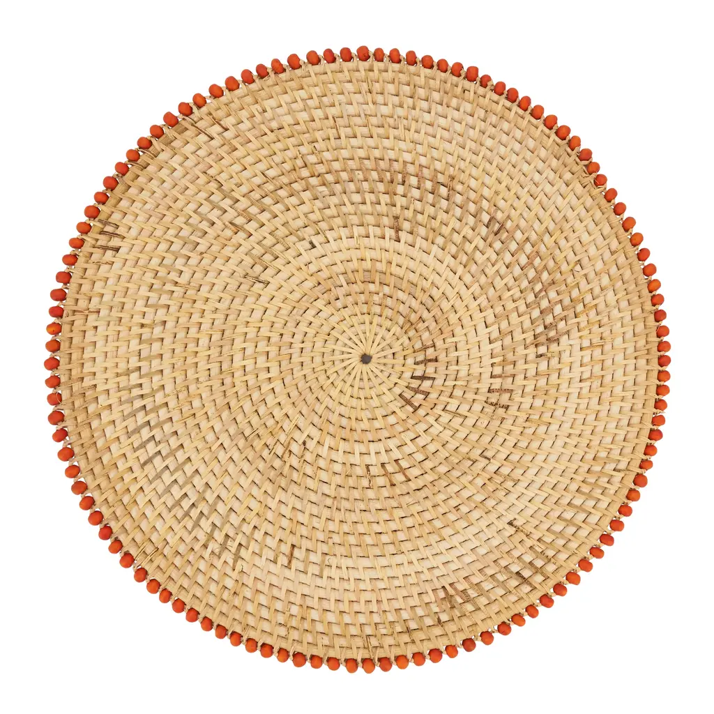 This durable honey-hued round placemat with pops of wood beads is all handcrafted beautifully by skilled artisans. Made of 100% natural vines, its nature inspired rustic color shades may vary due to its natural properties. Suitable for a variety of occasions, this timeless piece complements a range of tablescapes. Red color, Set of 4.