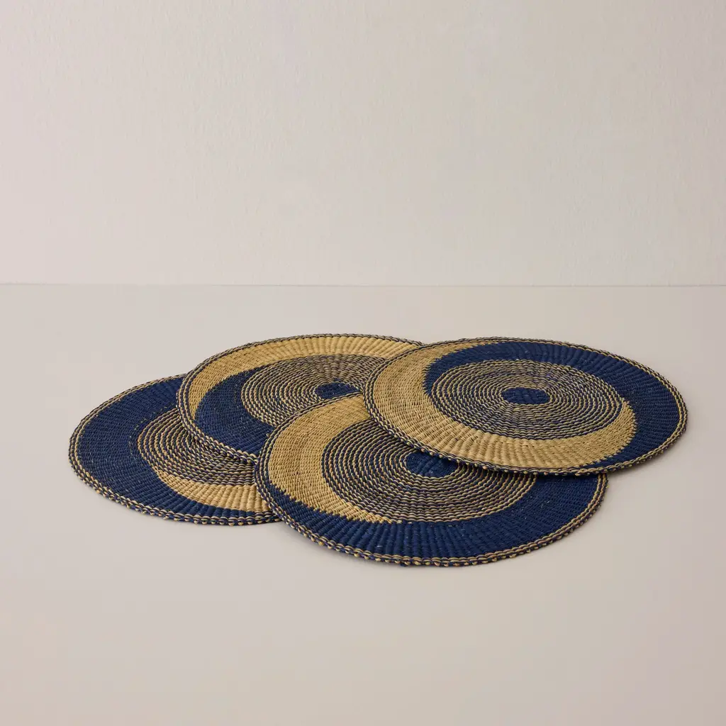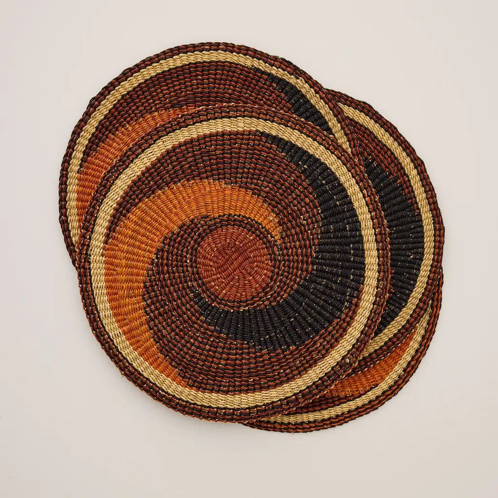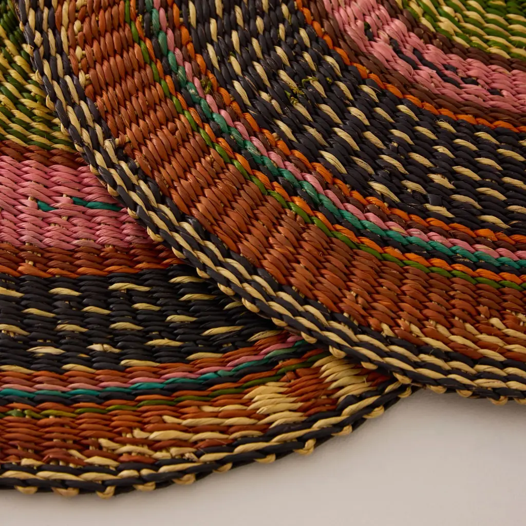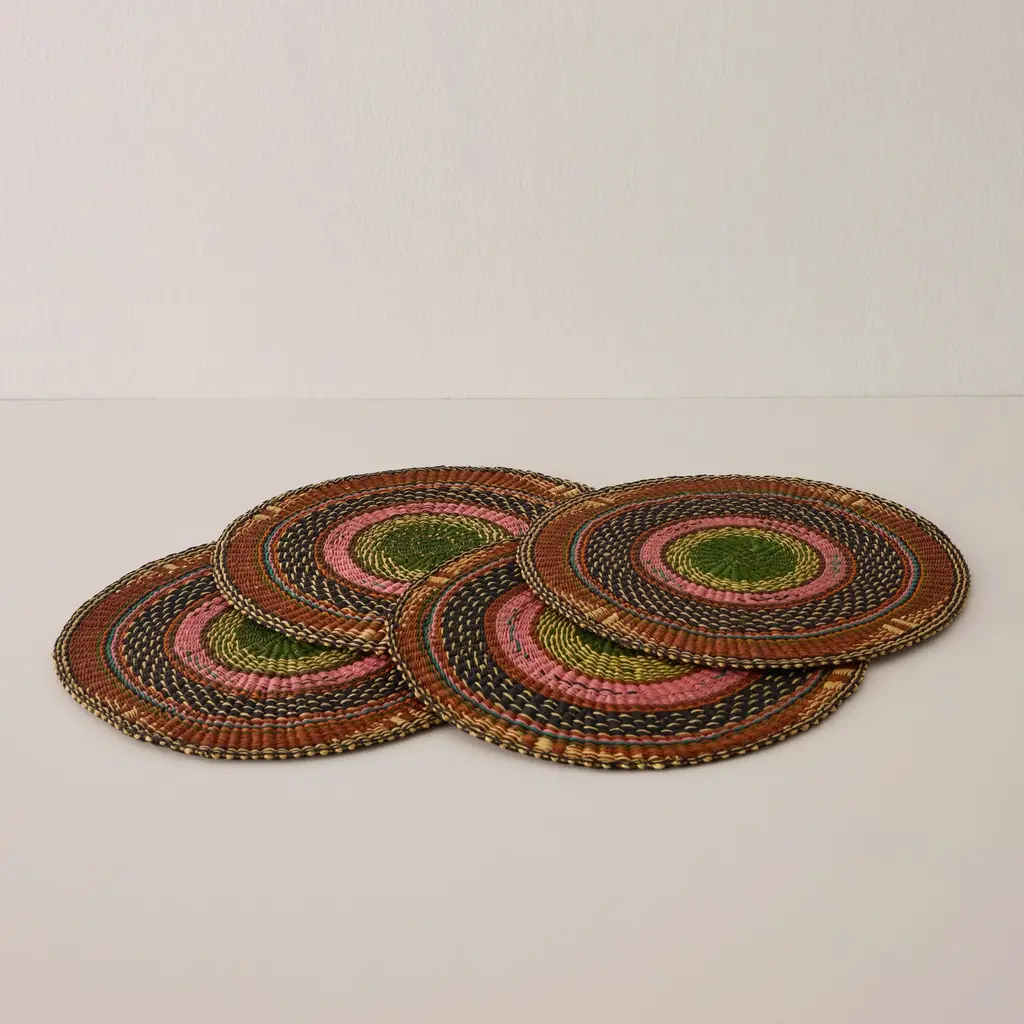 Whether you’re laying the table for breakfast or a special occasion, this colorful set of four Baba Tree round placemats will set a joyful tone for all your meals. Artfully hand-crafted in Ghana by Baba Tree’s talented artisan weavers, they are sustainably made of elephant grass, meaning they are durable and strong enough to withstand daily use. Even better, each piece is crafted under ethical working conditions and provides a meaningful income for its maker.The placemats are hand-dyed, so there may be slight variations in color.