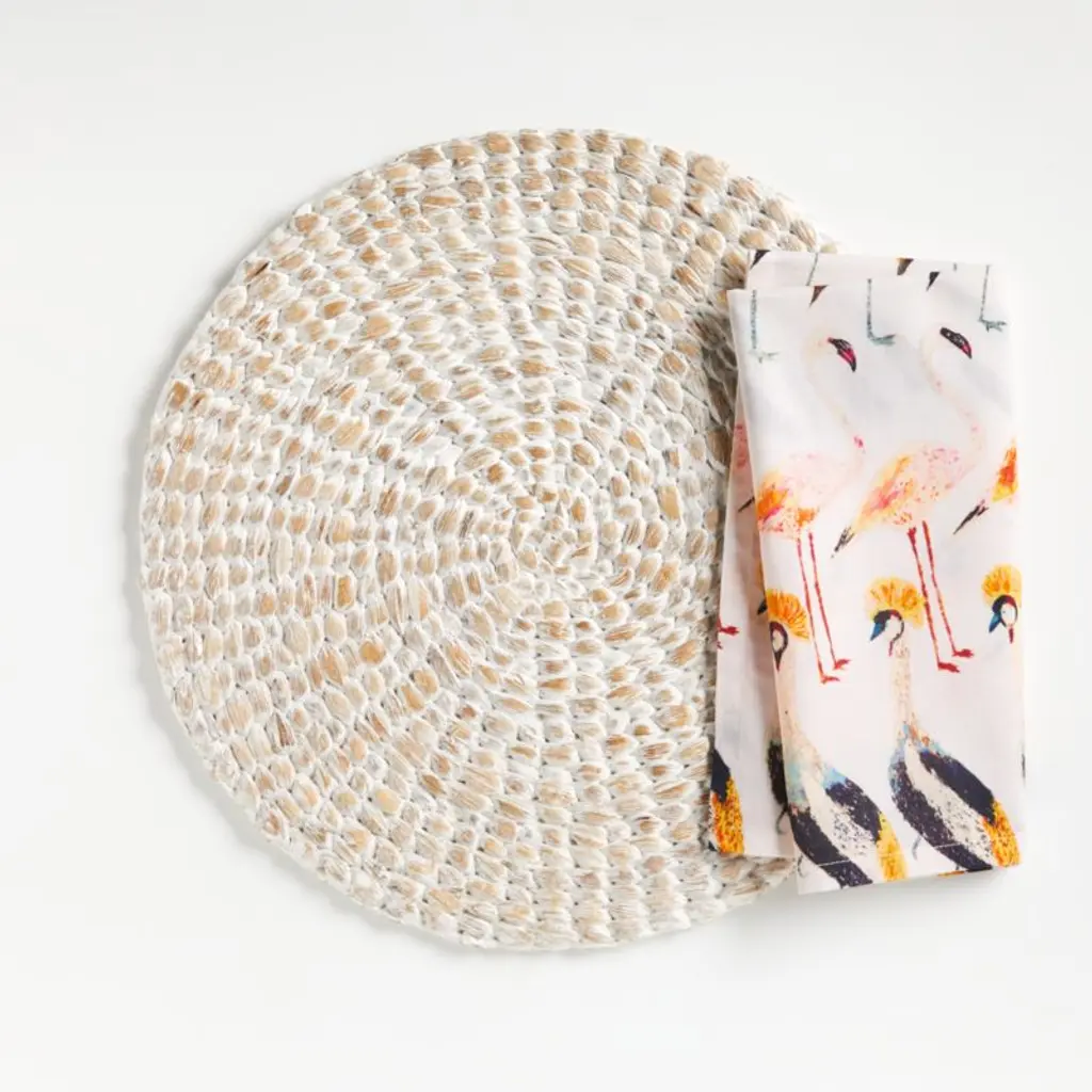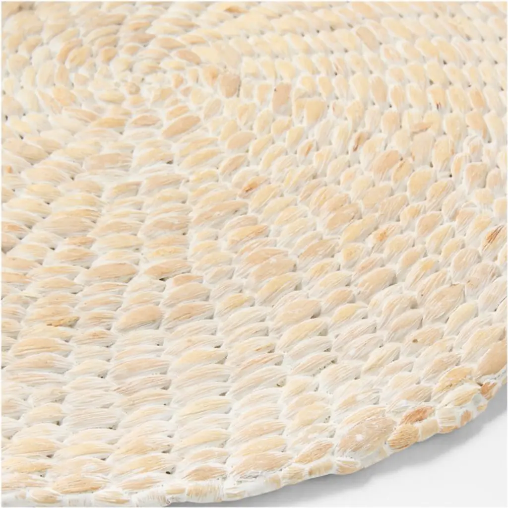 A whitewash finish adds a fresh, rustic update to a round placemat handwoven of natural water hyacinth fibers. A Crate and Barrel exclusive created by skilled artisans, our beautifully woven placemat brings warmth and natural appeal to modern organic dining tables, tropical outdoor dinner parties and cozy holiday tablescapes. And when the meal is complete, simply wipe down the durable mat with a damp cloth. Due to its handcrafted nature, each placemat will be slightly unique.