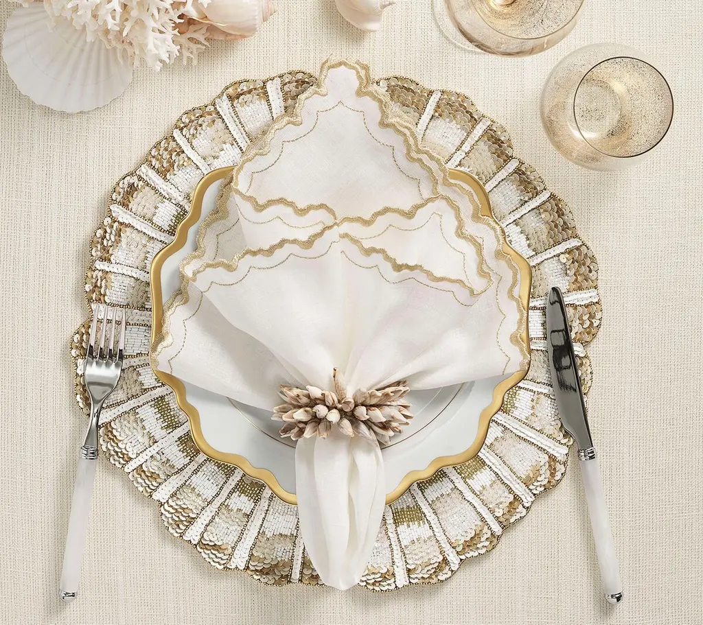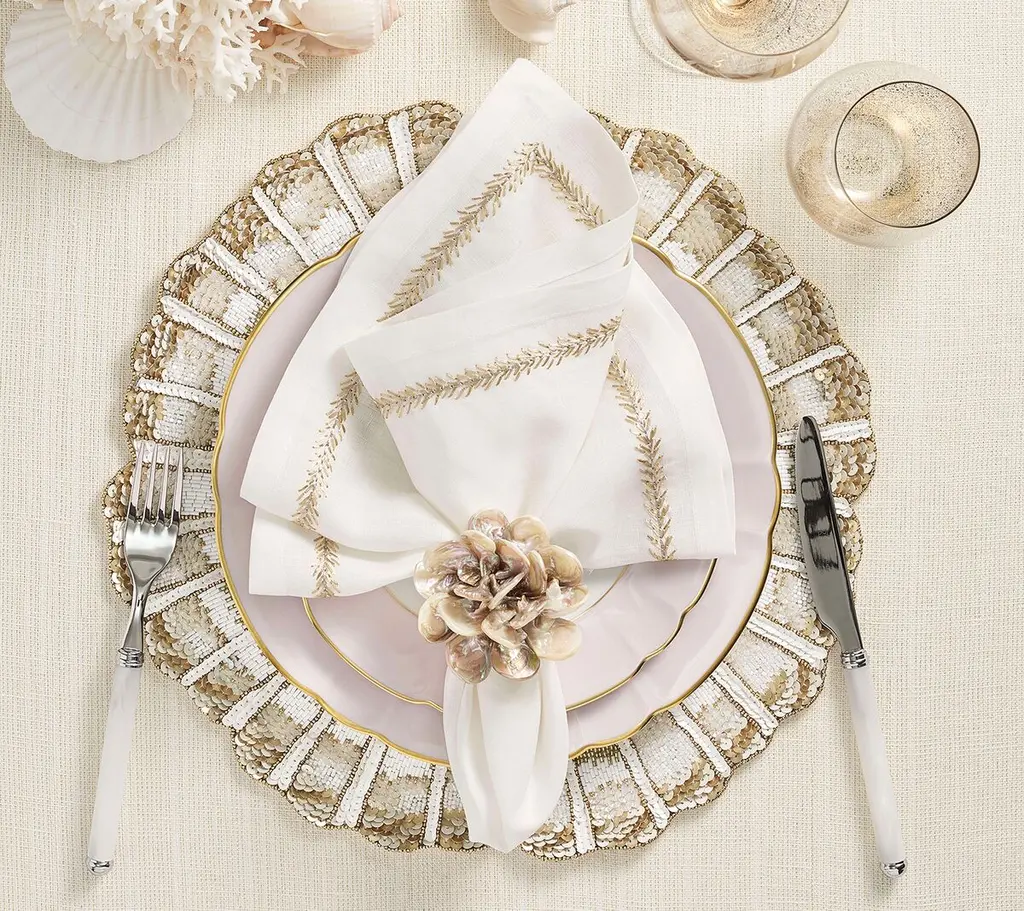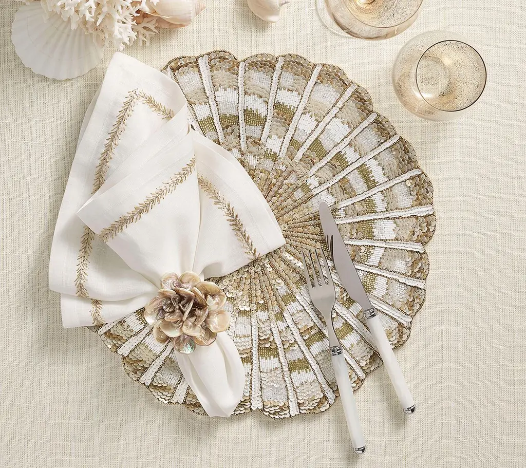 The Nautilus placemat artfully mimics its namesake, drawing inspiration from the organic spiral shell found in the ocean. A sophisticated twist on a traditional theme, this placemat features a hand-beaded abstract coiled design using a mix of beads. A captivating aquatic interpretation, this beautifully executed placemat will add a touch of pizazz to any setting, especially those parties by the sea or on a yacht.