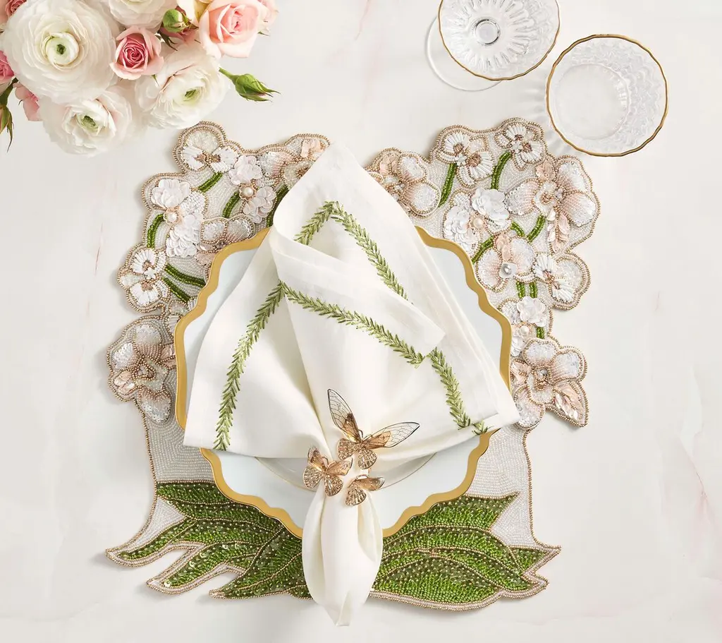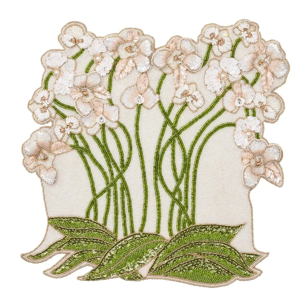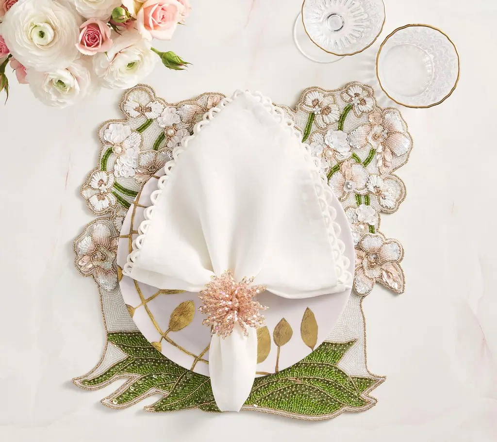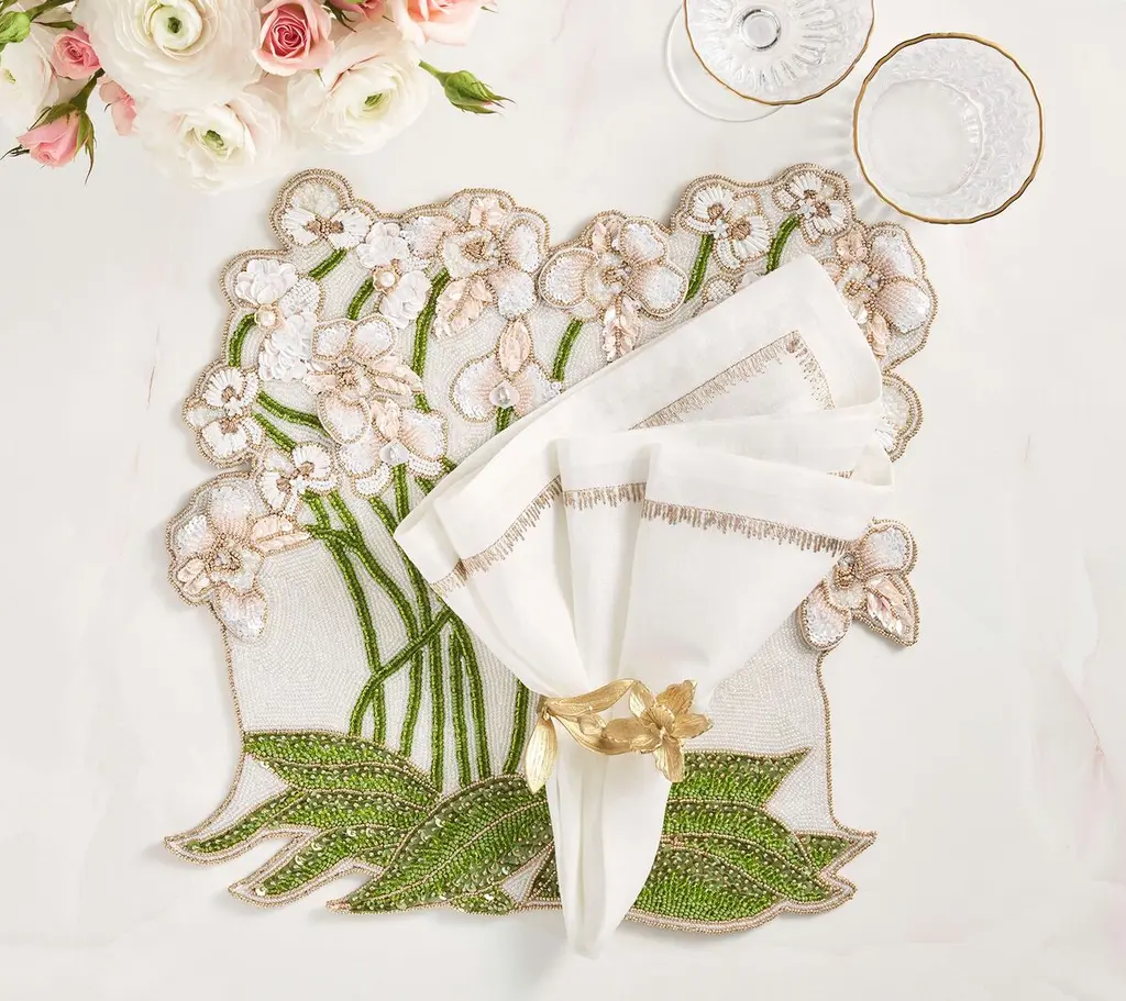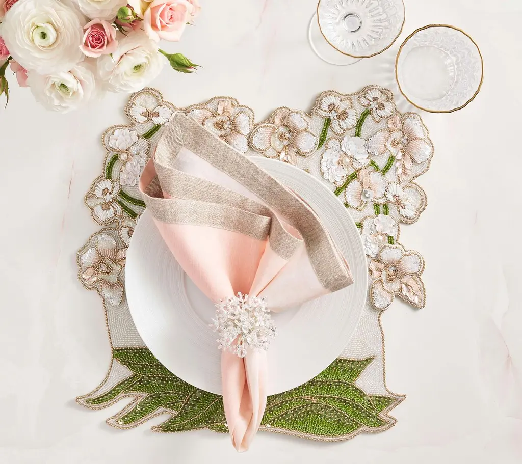 The Orchid Placemat creates a sense of occasion for every celebration. This captivating display of 25 unique gemstones presents a vivid orchid show with three-dimensional details that spark guests' imaginations. Add a dazzling napkin ring for the grand finale to this remarkable setting.