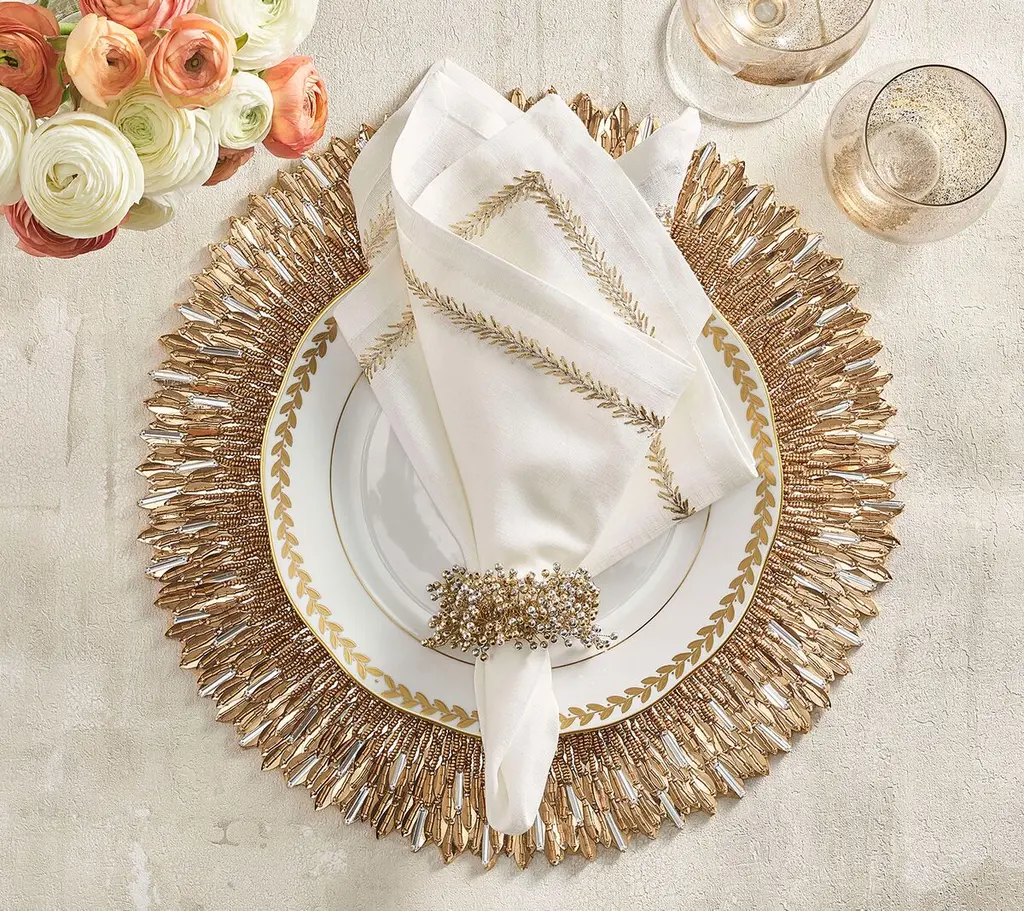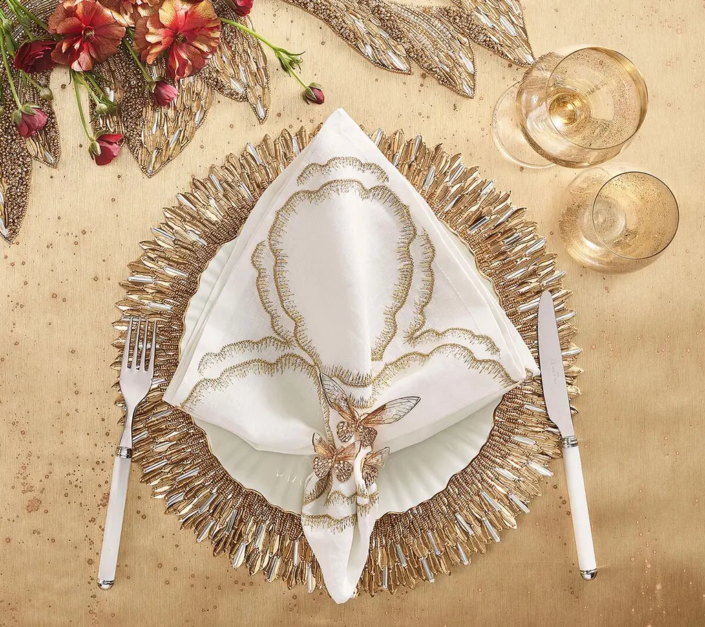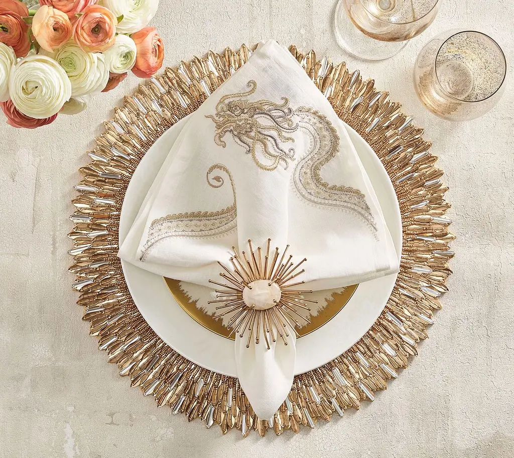 Layered sequins radiate from a beaded center on the magnificent Ray Placemat. Hand-applied feather-like sequins mimic beams of golden sunlight on the ocean. It beautifully frames a dinner plate. Variations of beads pepper this placemat, adding depth and sparkle. Complete this sophisticated look with the Ray Runner. Its colors make it suitable for formal entertaining as well.