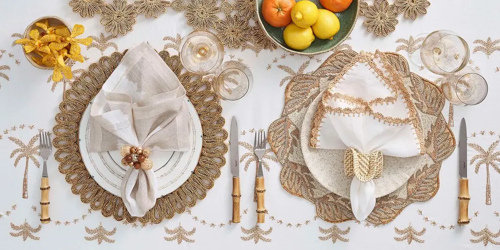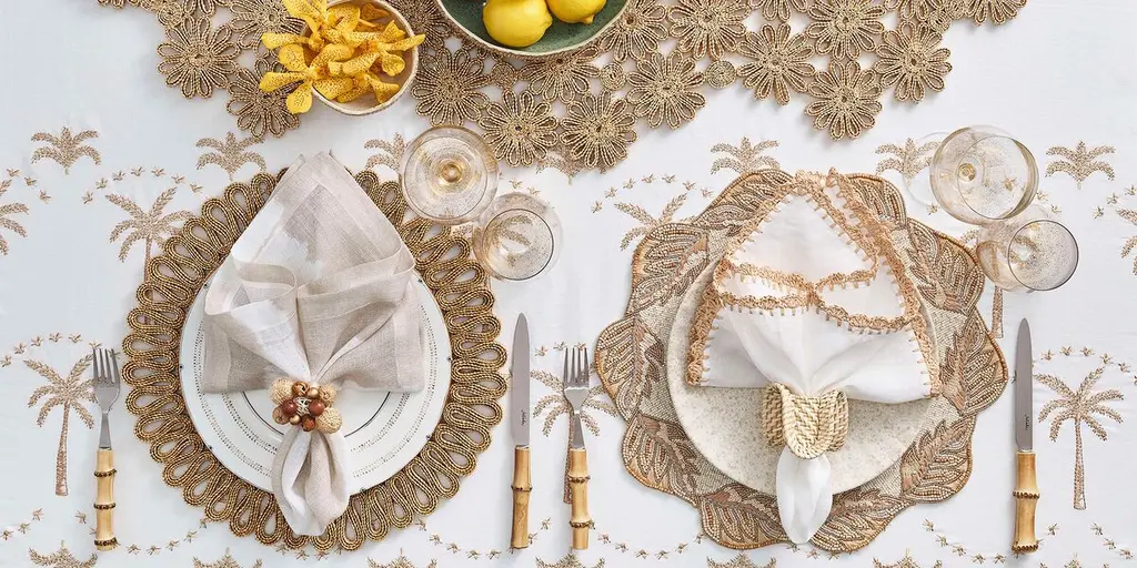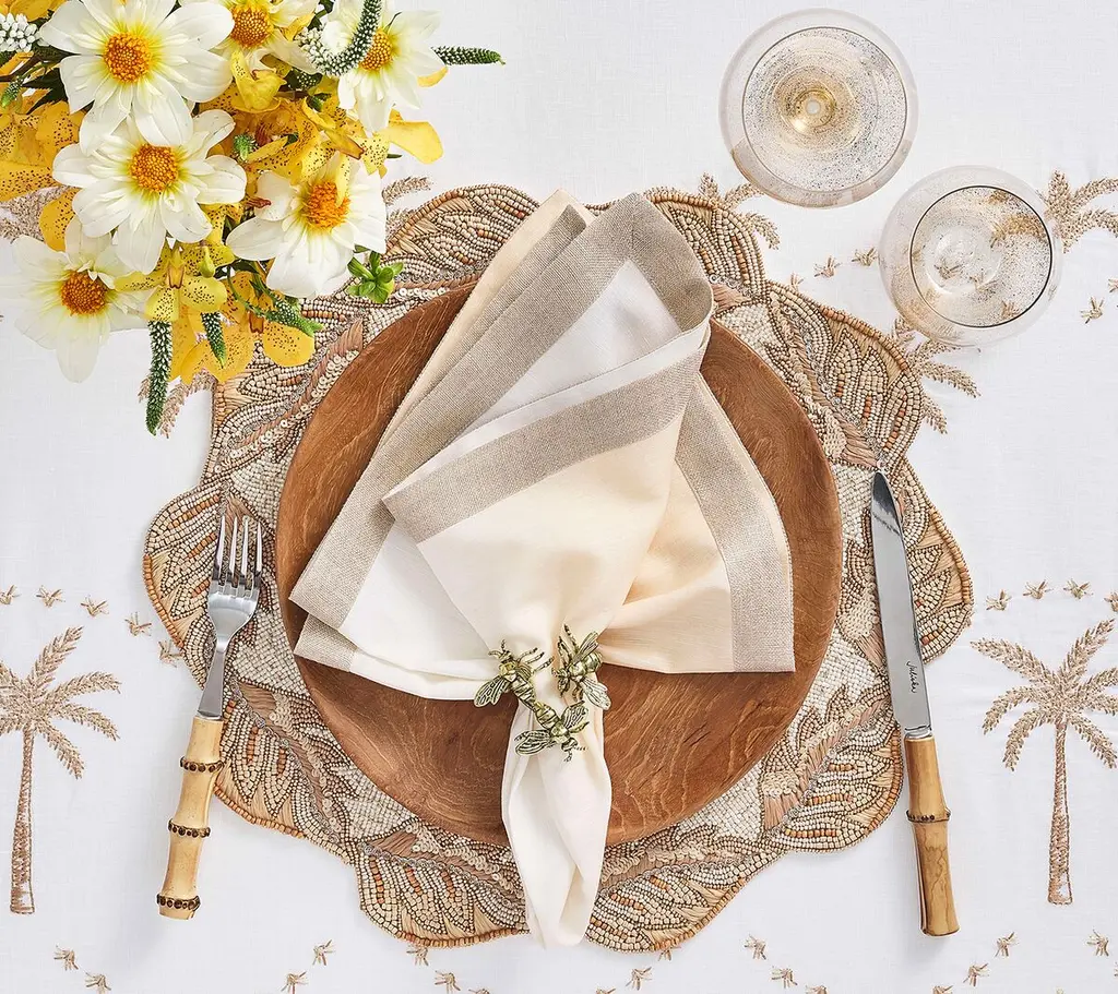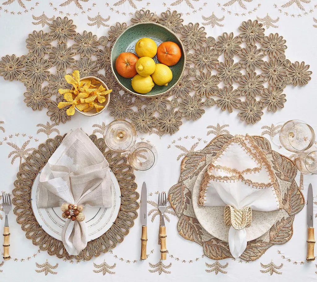 The Winding Vines placemat is a work of art that features over 10 unique bead variations. It features a frame of intricate leaves made from glass, raffia, and wooden beads along with layered sequins. Its textured body is composed of seed beads and sequins, adding depth and movement. This placemat can decorate a table for a small soiree or a grand, decadent gala. Pair this placement with the Winding Vines napkin for an elevated tropical vibe.