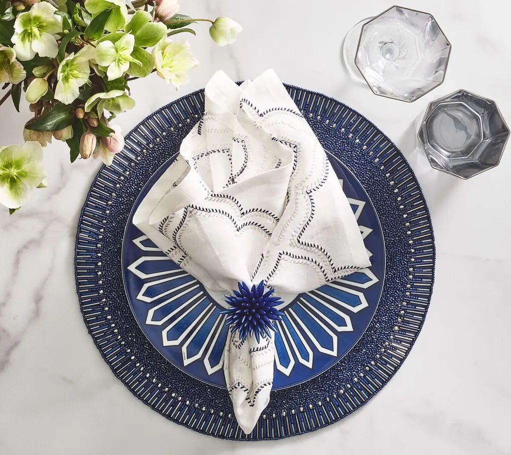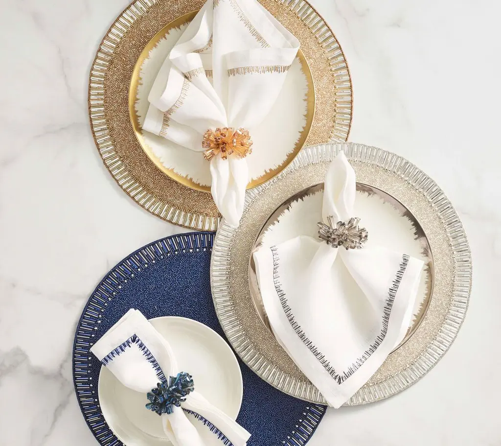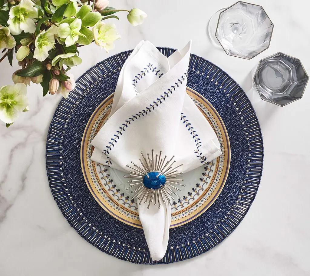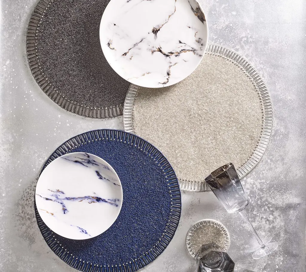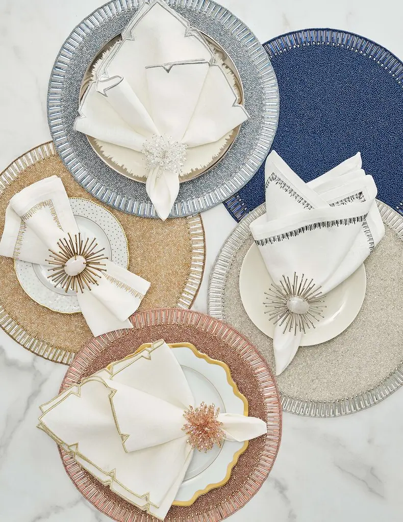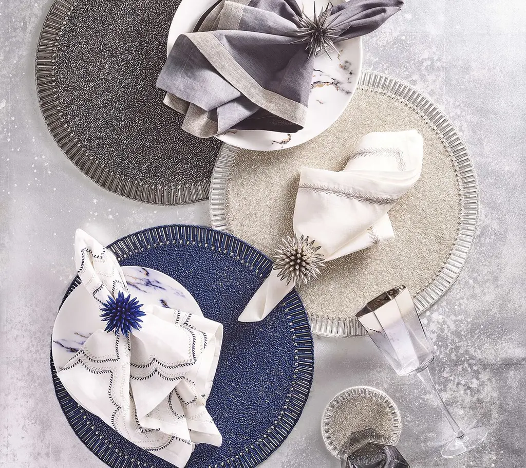 Mimicking baguette stones that are typically found on jewelry; the graceful Bevel Placemat exudes understated elegance. Glass and acrylic beads are arranged in a pave pattern on the Bevel Placemat, creating a halo effect.