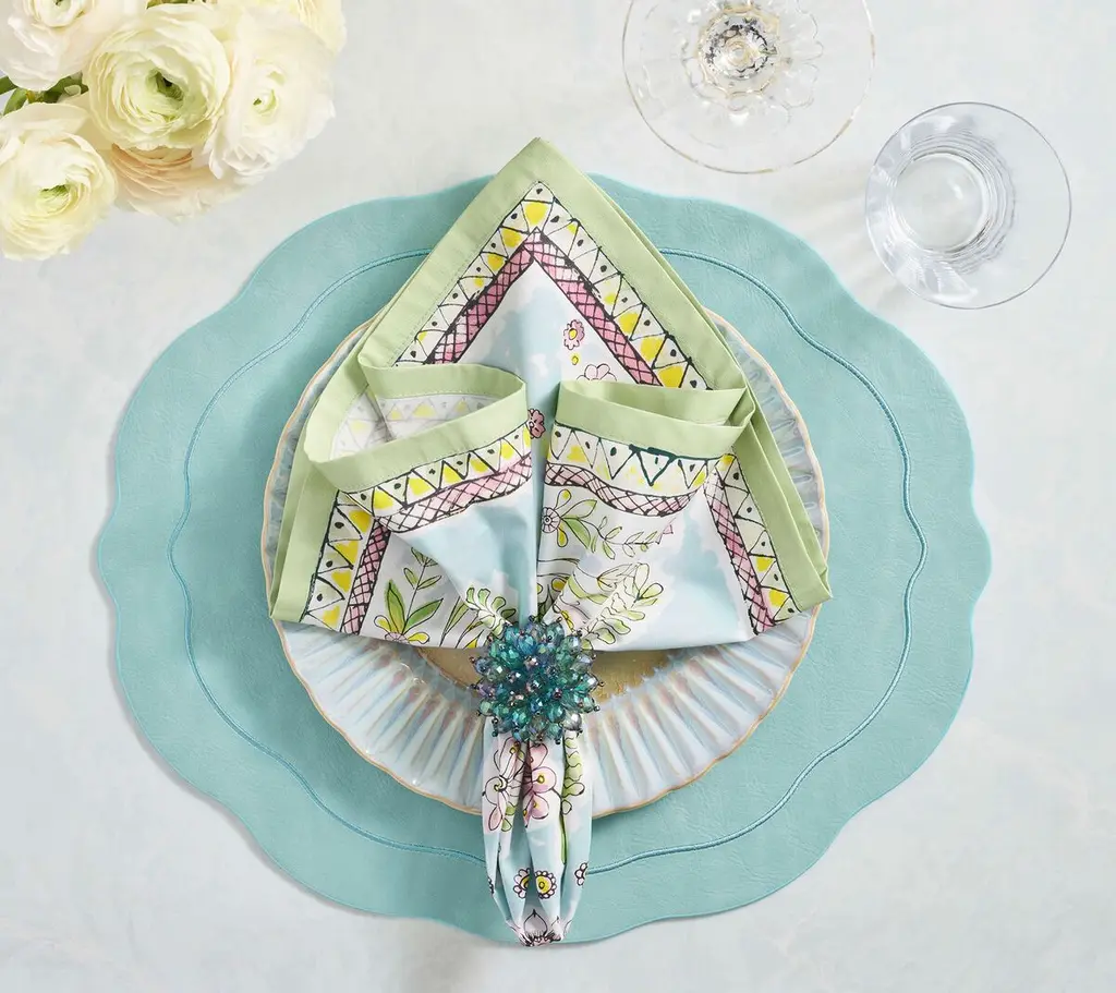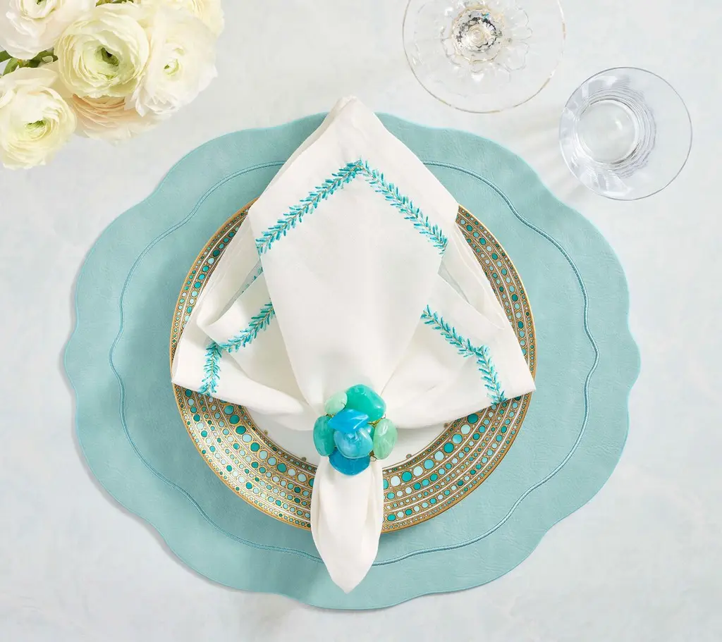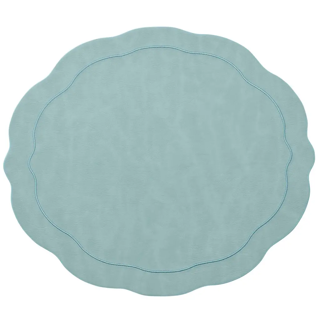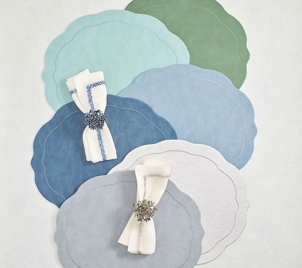 The traditional oval shape gets a modern refresh with the matte faux leather Tailored Placemat. A stylish wavy edge and embroidered tone-on-tone border detailing elevate this faux leather accessory. This hard-backed, versatile placemat is available in a variety of colors, suitable for various entertaining themes, whether it's a spring tea party, a seafood boil event, or everything in between. This versatile placemat effortlessly adapts to both dressed-up and more laid-back settings.