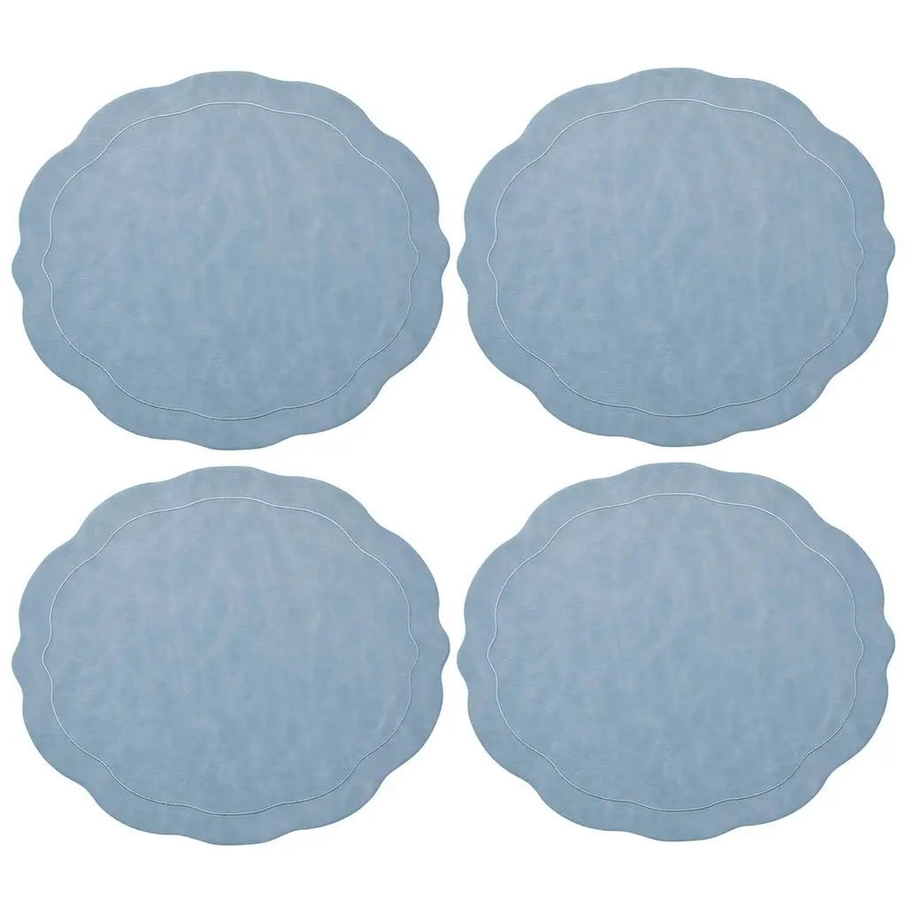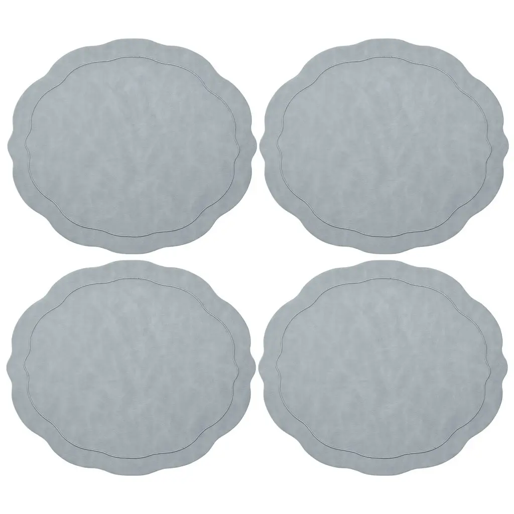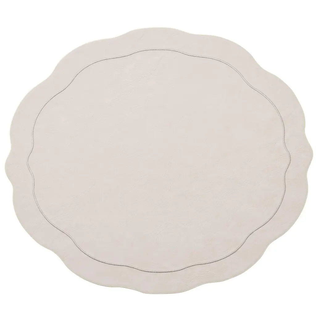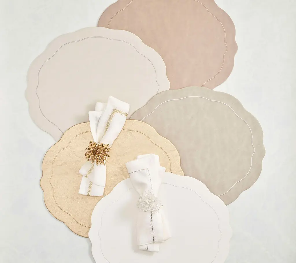 The traditional oval shape gets a modern refresh with the matte faux leather Tailored Placemat. A stylish wavy edge and embroidered tone-on-tone border detailing elevate this faux leather accessory. This hard-backed, versatile placemat is available in a variety of colors, suitable for various entertaining themes, whether it's a spring tea party, a seafood boil event, or everything in between. This versatile placemat effortlessly adapts to both dressed-up and more laid-back settings.