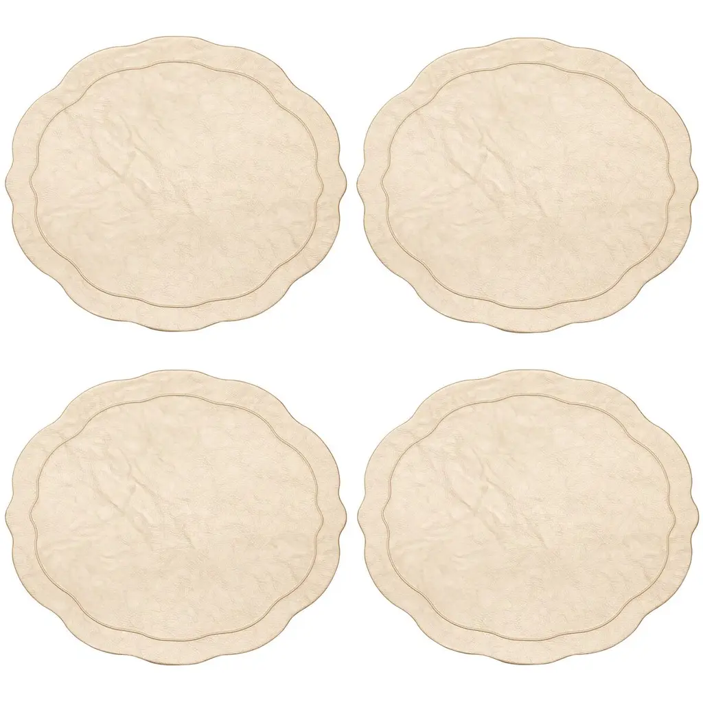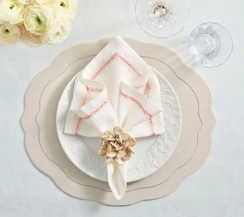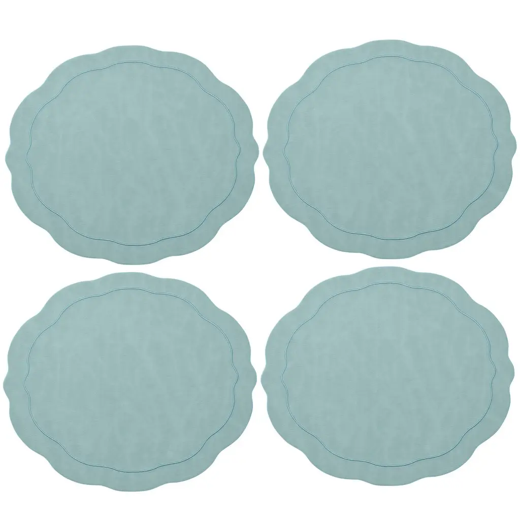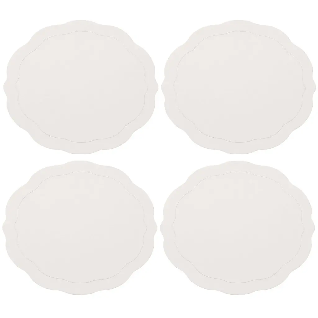The traditional oval shape gets a modern refresh with the matte faux leather Tailored Placemat. A stylish wavy edge and embroidered tone-on-tone border detailing elevate this faux leather accessory. This hard-backed, versatile placemat is available in a variety of colors, suitable for various entertaining themes, whether it's a spring tea party, a seafood boil event, or everything in between. This versatile placemat effortlessly adapts to both dressed-up and more laid-back settings.