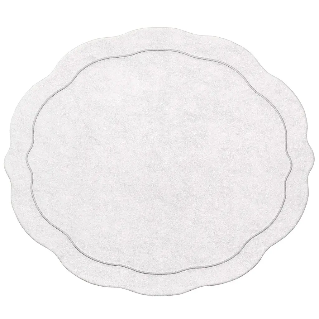The traditional oval shape gets a modern refresh with the matte faux leather Tailored Placemat. A stylish wavy edge and embroidered tone-on-tone border detailing elevate this faux leather accessory. This hard-backed, versatile placemat is available in a variety of colors, suitable for various entertaining themes, whether it's a spring tea party, a seafood boil event, or everything in between. This versatile placemat effortlessly adapts to both dressed-up and more laid-back settings.