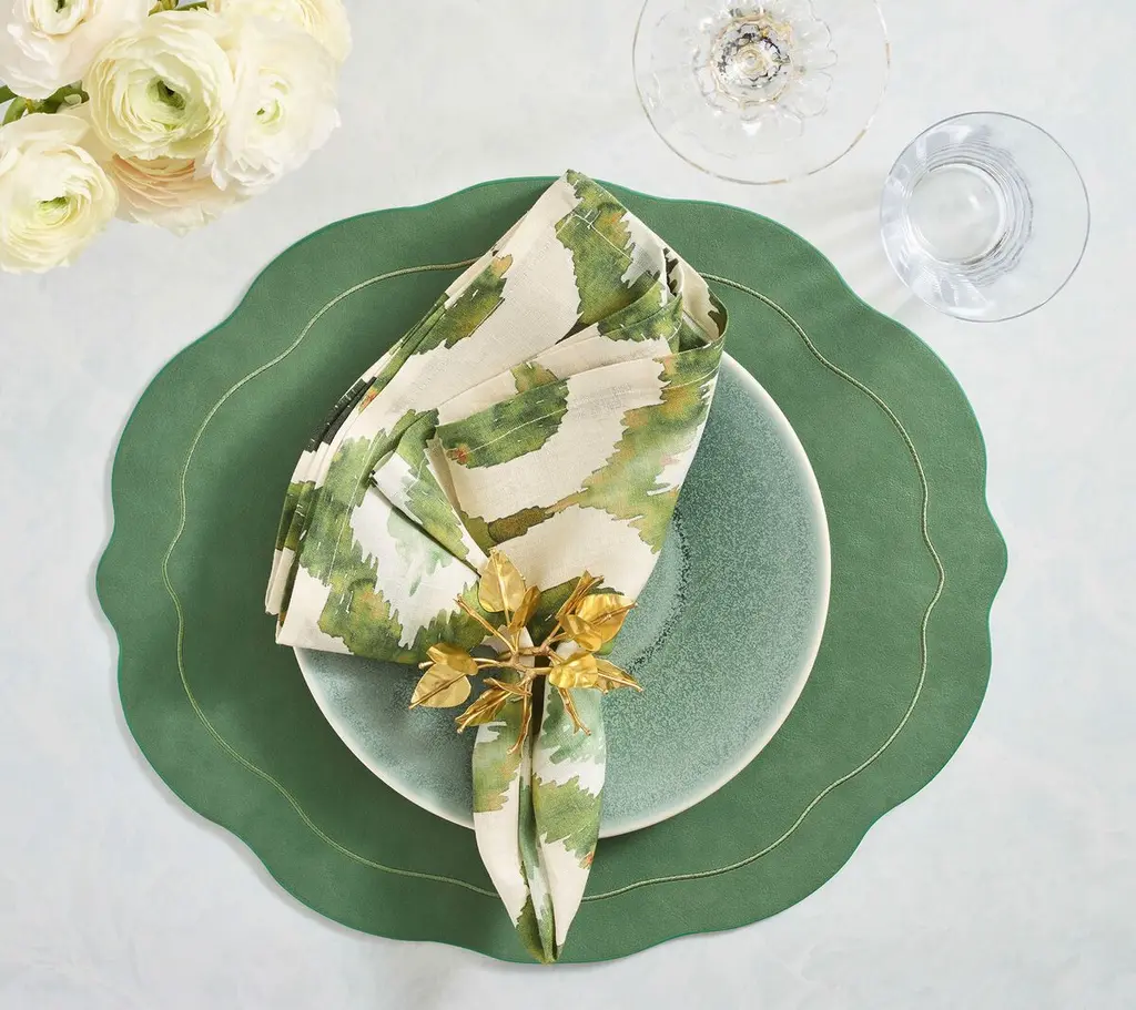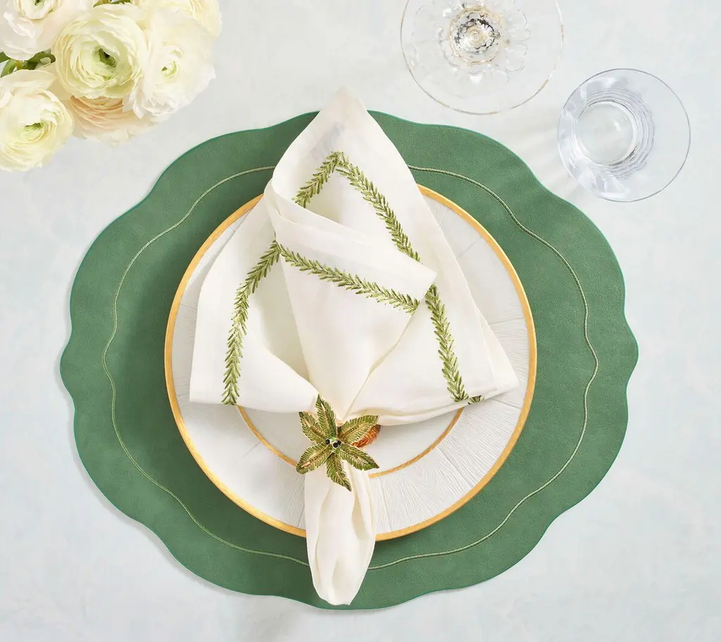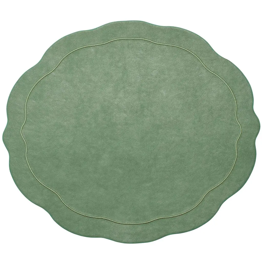 The traditional oval shape gets a modern refresh with the matte faux leather Tailored Placemat. A stylish wavy edge and embroidered tone-on-tone border detailing elevate this faux leather accessory. This hard-backed, versatile placemat is available in a variety of colors, suitable for various entertaining themes, whether it's a spring tea party, a seafood boil event, or everything in between. This versatile placemat effortlessly adapts to both dressed-up and more laid-back settings.