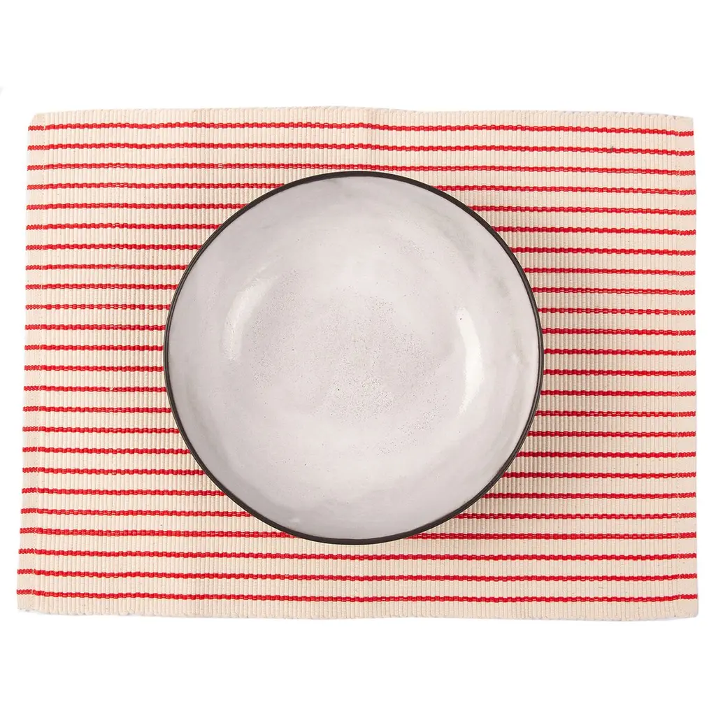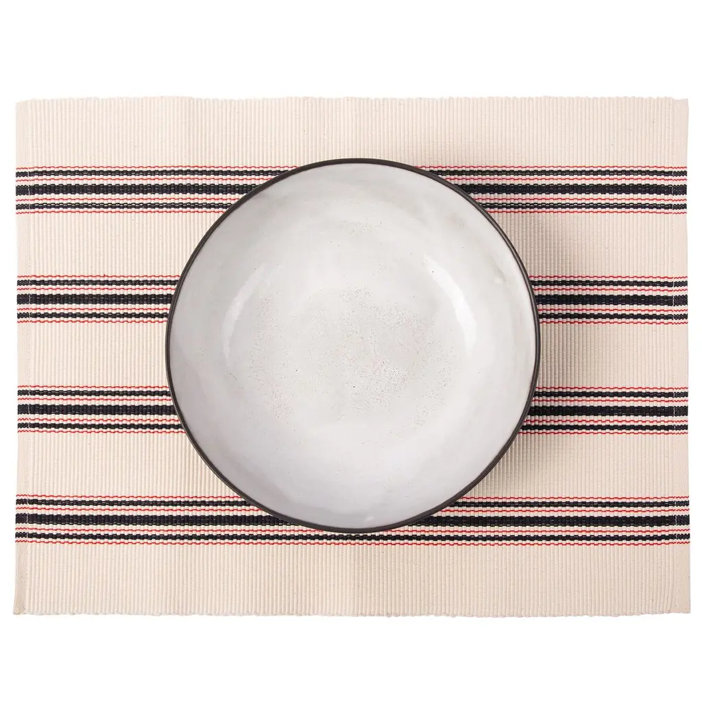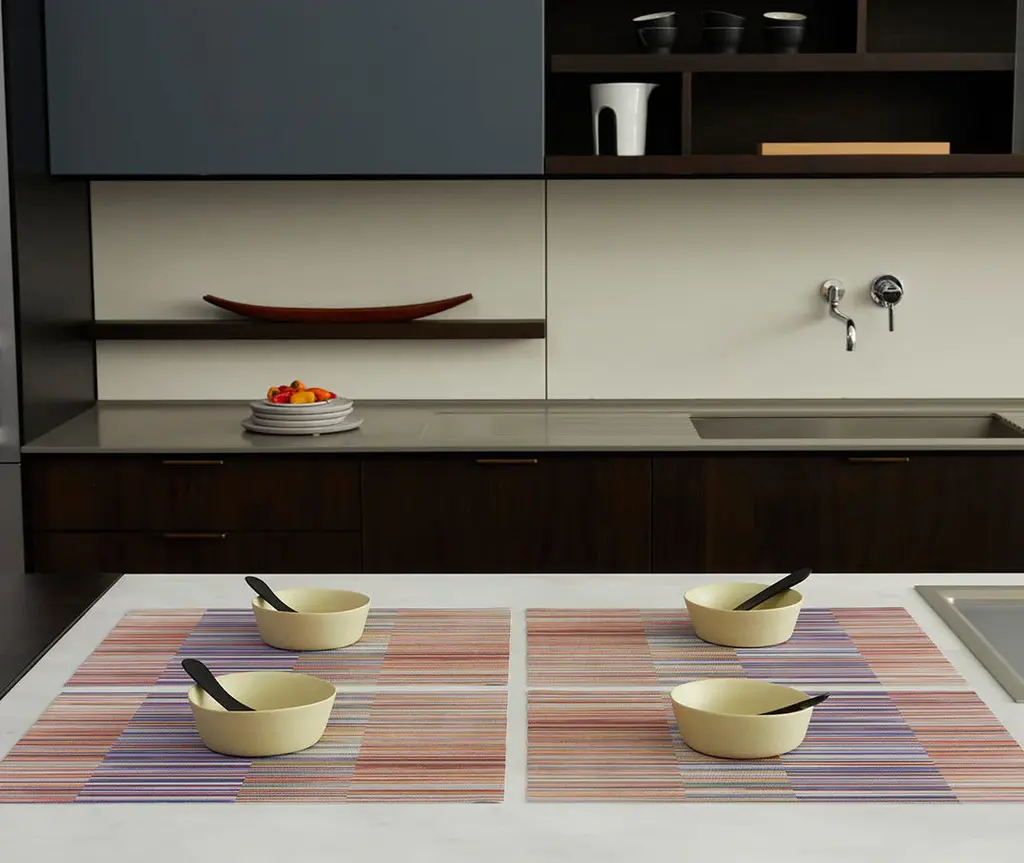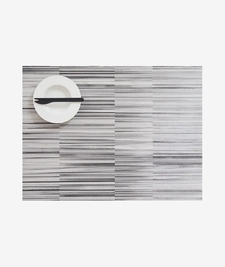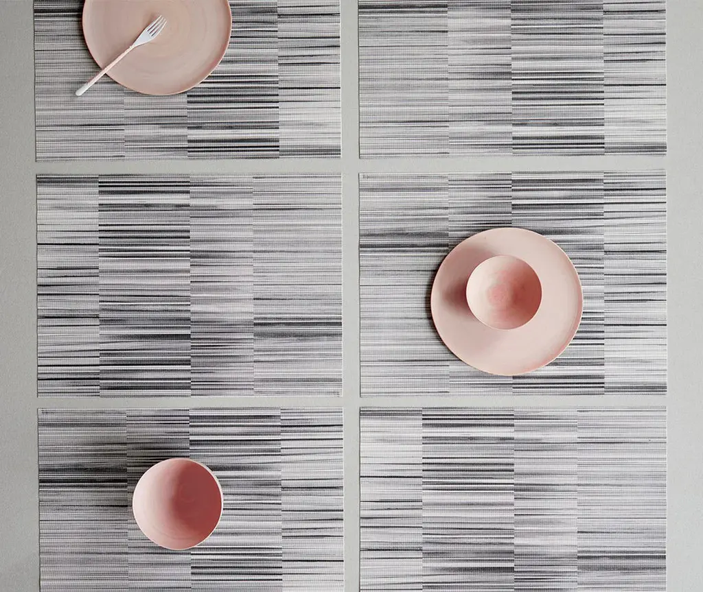With its finely striped bands of varying widths and tones, this graphic design is a printed interpretation of the Japanese tradition of weaving scraps of old fabrics into sakiori textiles, from the word saku (to tear or rip) and oru (to weave). The Chilewich design team looked to antique sakiori textiles for inspiration and reimagined their intricate weave structures and lively lines in two dimensions with ink and paint. TO CLEAN: Simply wipe with soap, water and a soft sponge or cloth. Scrub stubborn stains with a soft bristle-brush and a bleach-based cleanser. For over a decade, New York based designer Sandy Chilewich has been creating original and innovative vinyl products for the home. Her woven, tufted, molded and spun textiles are available in a range of vibrant and neutral hues that have become synonymous with the Chilewich brand name.