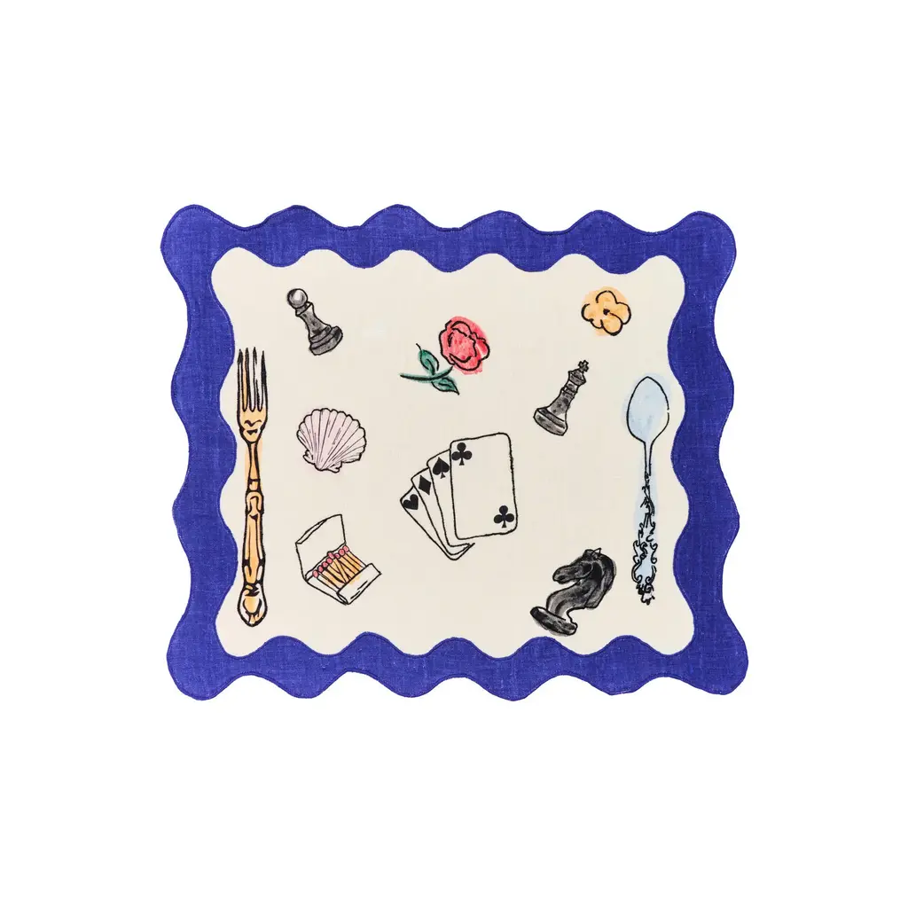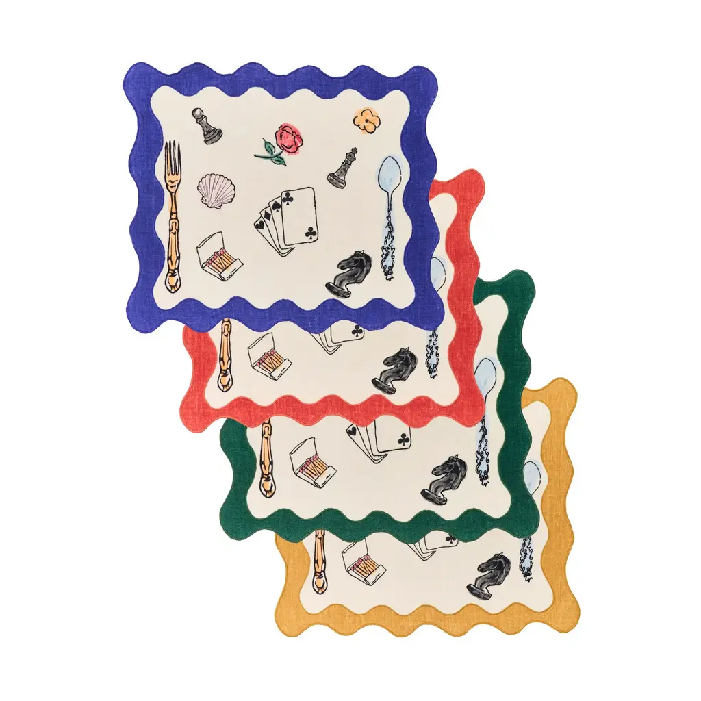 Enhance your game nights or family gatherings with the Salon Motif Scallop Embroidered Linen Placemat (Set of 4) from Misette. Crafted from 100% structured linen, each set of four features vibrant backgammon designs, applique trim, or hand-illustrated parlor game motifs that add warmth and charm to your table. Machine-washable and designed to soften beautifully over time, these placemats arrive elegantly packaged in a dust bag, perfect for both everyday use and special occasions. Highlights