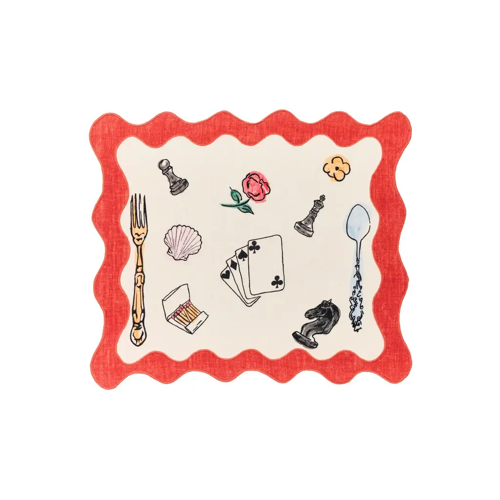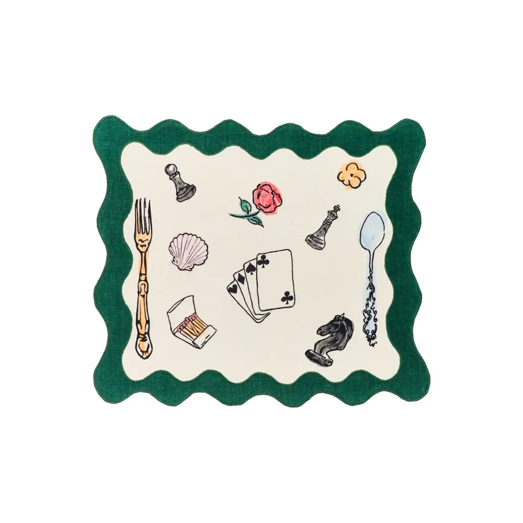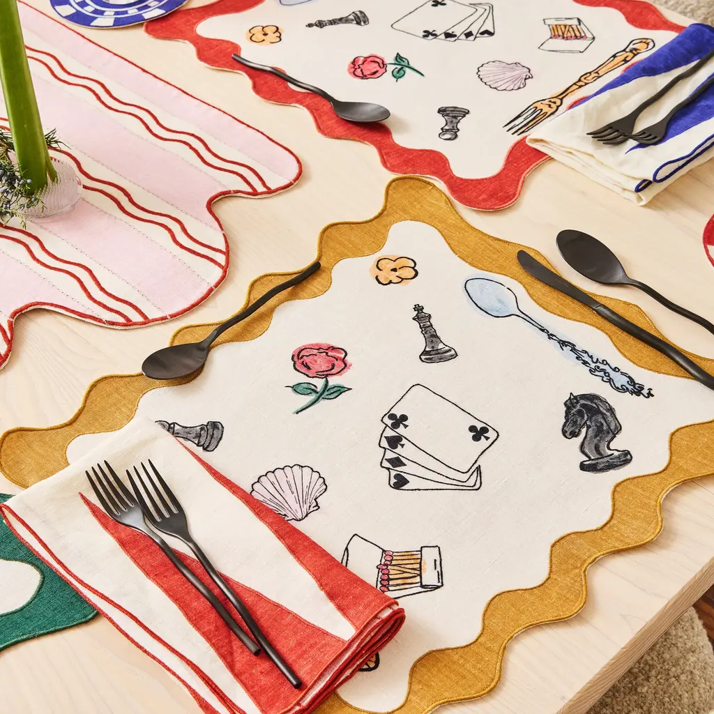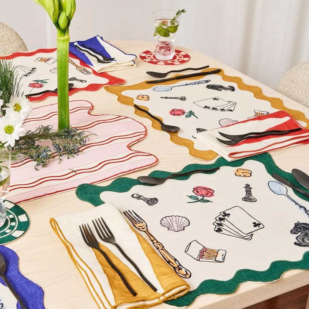 Enhance your game nights or family gatherings with the Salon Motif Scallop Embroidered Linen Placemat (Set of 4) from Misette. Crafted from 100% structured linen, each set of four features vibrant backgammon designs, applique trim, or hand-illustrated parlor game motifs that add warmth and charm to your table. Machine-washable and designed to soften beautifully over time, these placemats arrive elegantly packaged in a dust bag, perfect for both everyday use and special occasions. Highlights