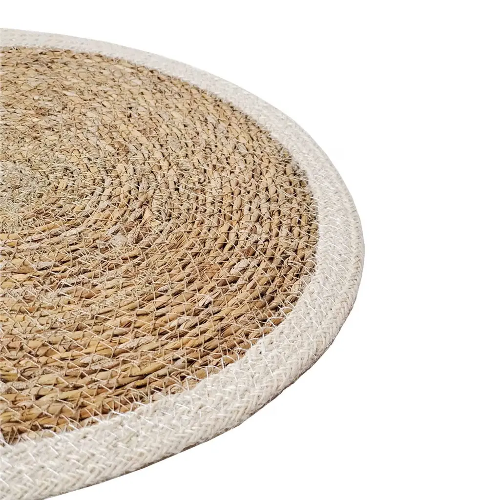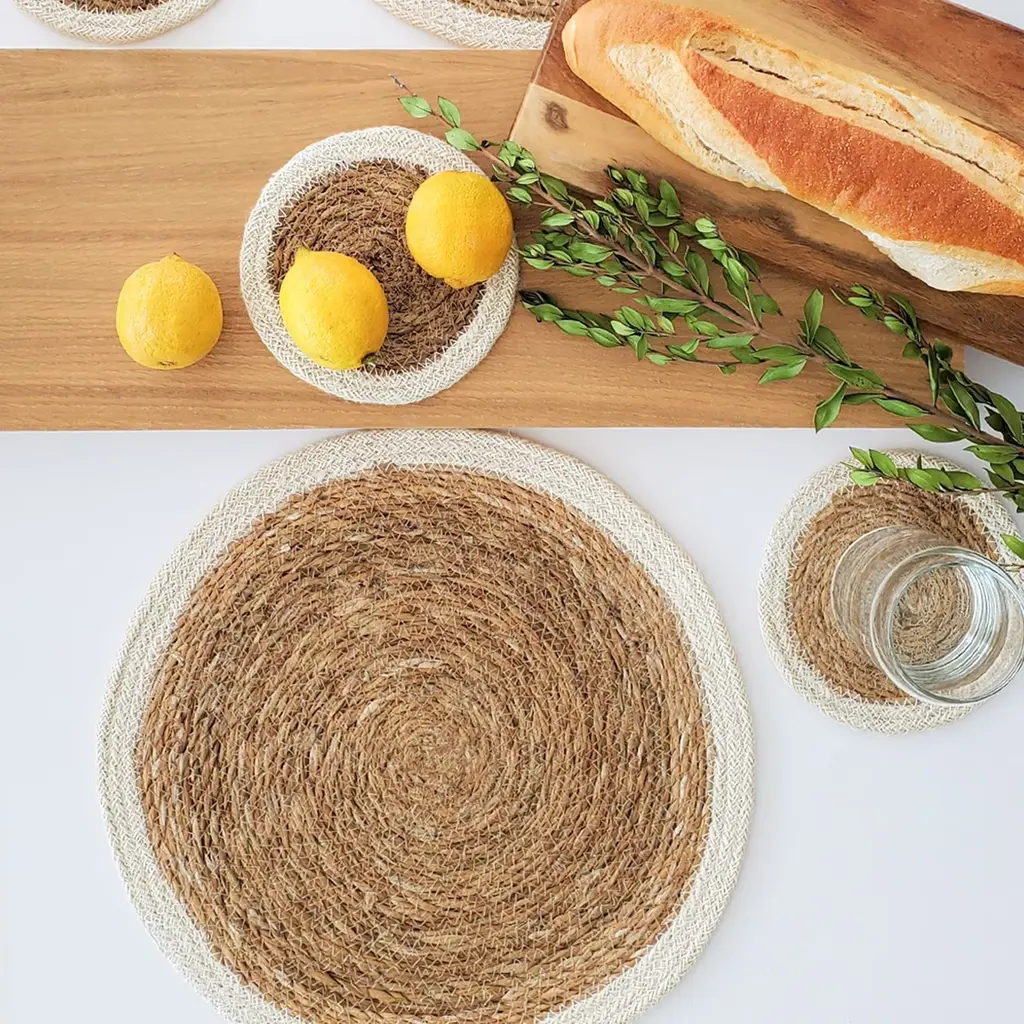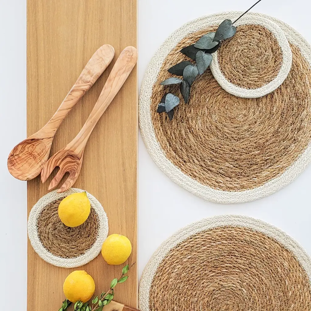 Add natural textures and neutral color to your kitchen or dining table with our natural seagrass placemats. These handwoven placemats protect your tabletop and the simplicity of natural color will easily coordinate with any color & provide a perfect finish to your table setting. Each product is designed and curated by Korissa, sustainably handmade by Fair Trade artisans in Bangladesh.