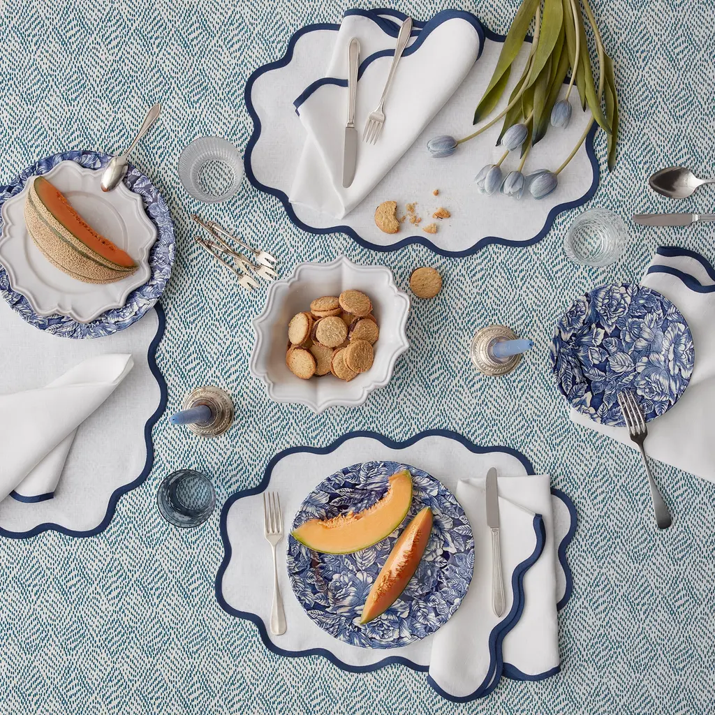 Undulating edges and a contrasting trim accent this lovely set of linens, from Matouk.