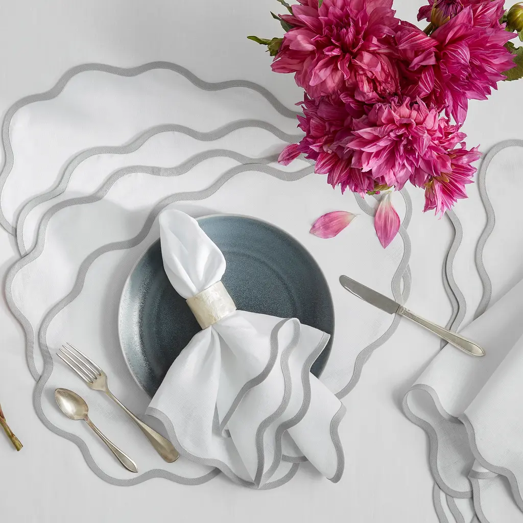 Undulating edges and a contrasting trim accent this lovely set of linens, from Matouk.