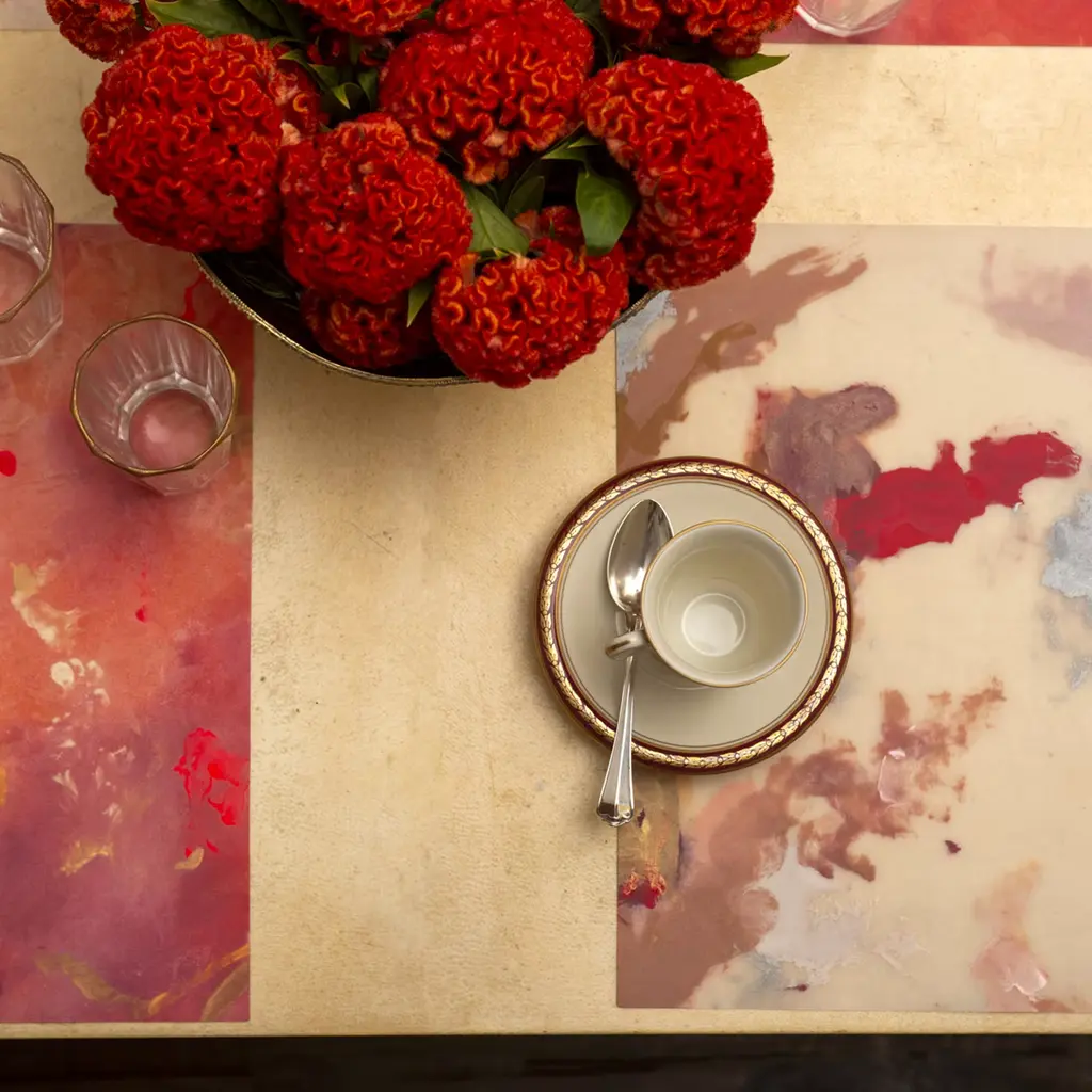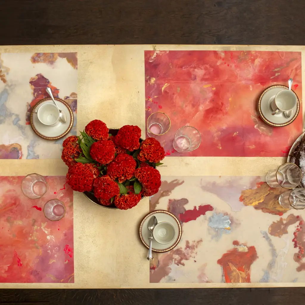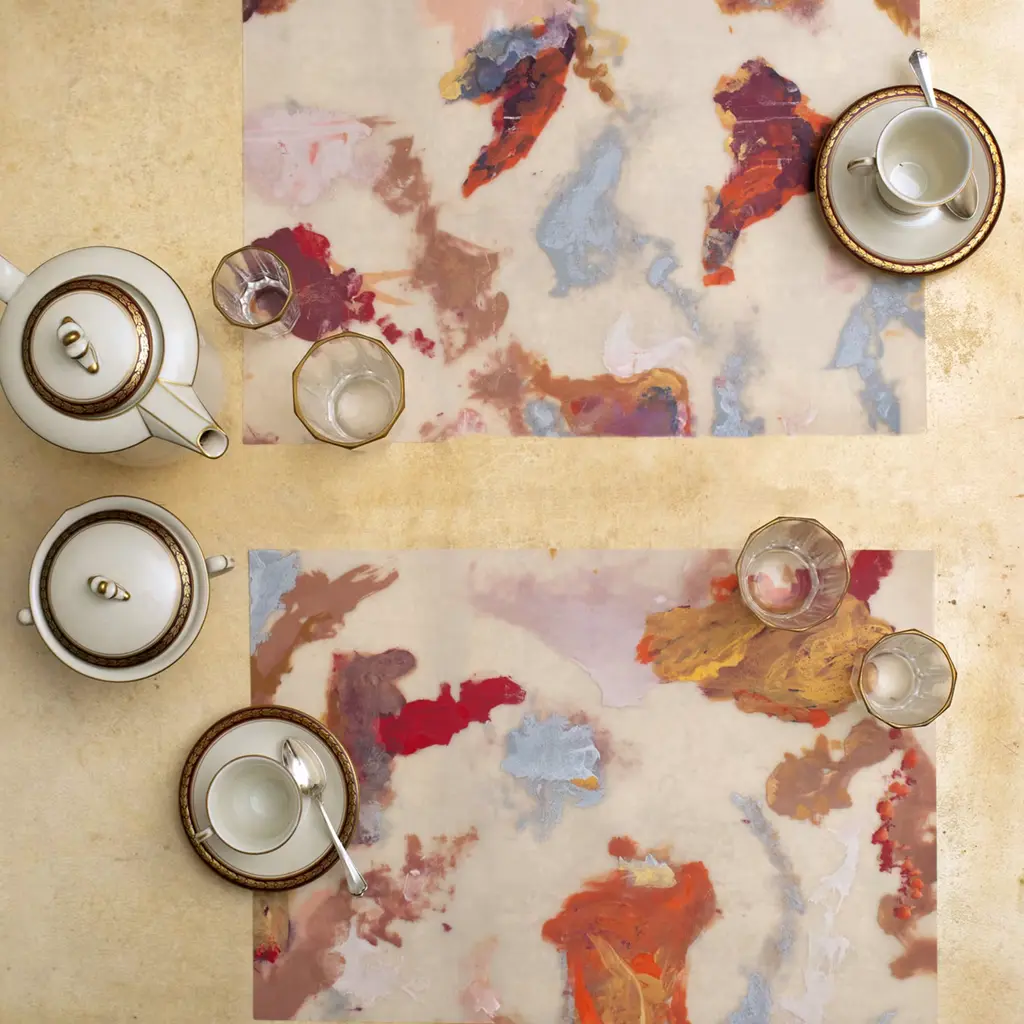 Mesmerizing, iridescent colors grace the rectangular surface of these two placemats, an original artwork by Luisa Longo. Printed on linen, each piece is light and flexible for use and storage.