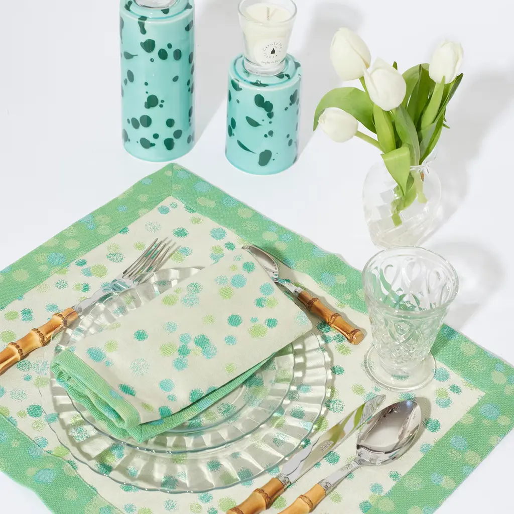 Set of two decorative placemats and napkins in aqua and green 100% cotton jacquard fabric. Its exclusive textile pattern recalls the traditional Apulian macchiato technique, the brand's emblem, as a celebration of the joyful spontaneity of nature. This refined placemat set is entirely handmade in Italy and woven on the ancient looms of a historic Apulian weaving mill with respect for history, nature, and people.