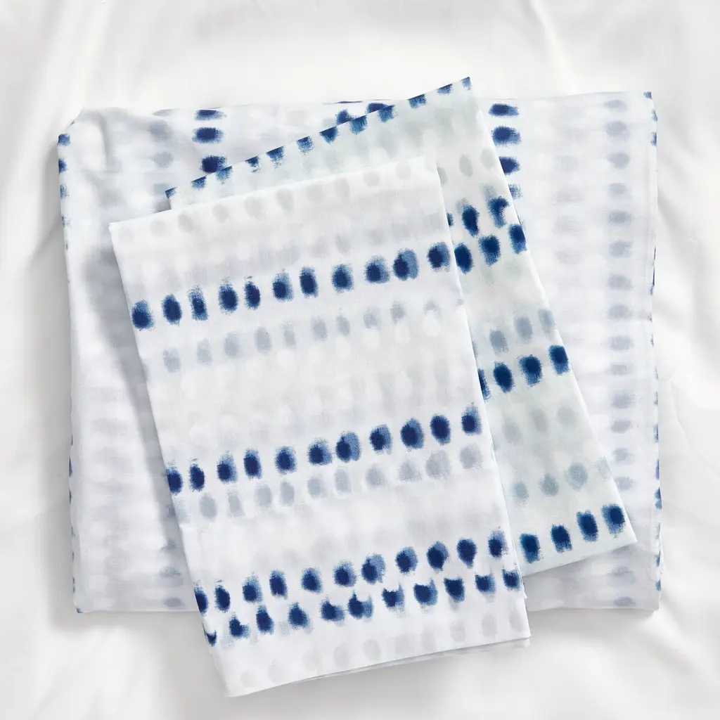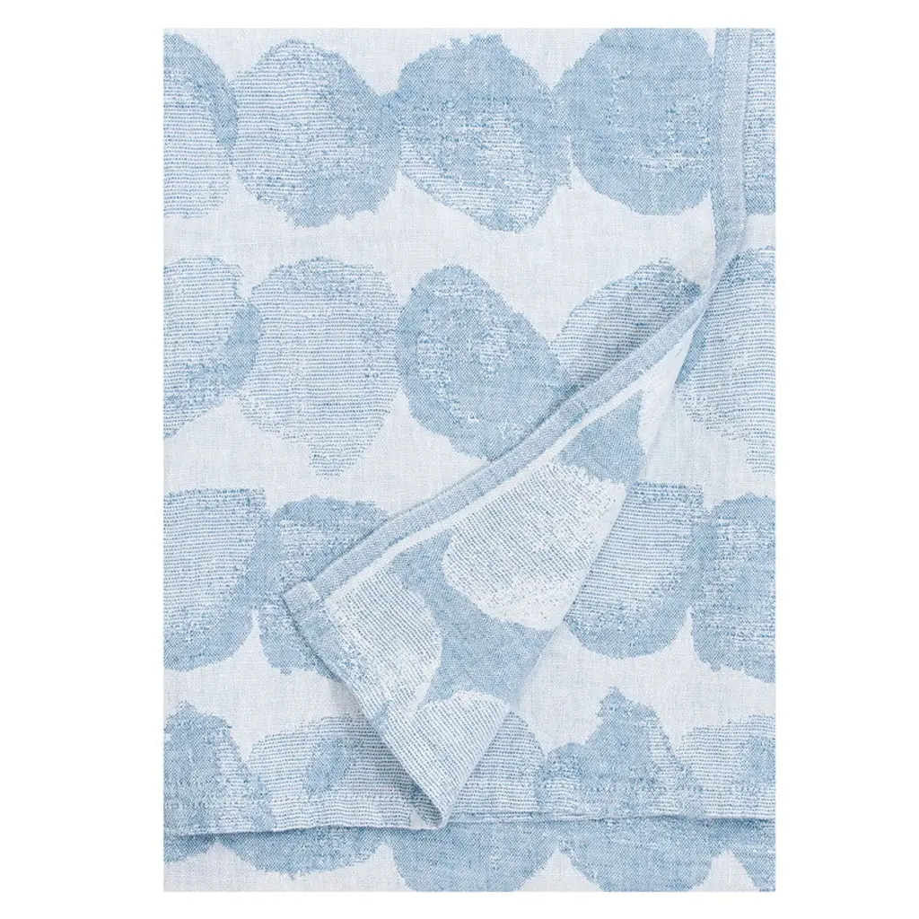 Set of two decorative placemats and napkins in light blue and blue 100% cotton jacquard fabric. Its exclusive textile pattern recalls the traditional Apulian macchiato technique, the brand's emblem, as a celebration of the joyful spontaneity of nature. This refined placemat set is entirely handmade in Italy and woven on the ancient looms of a historic Apulian weaving mill with respect for history, nature, and people.