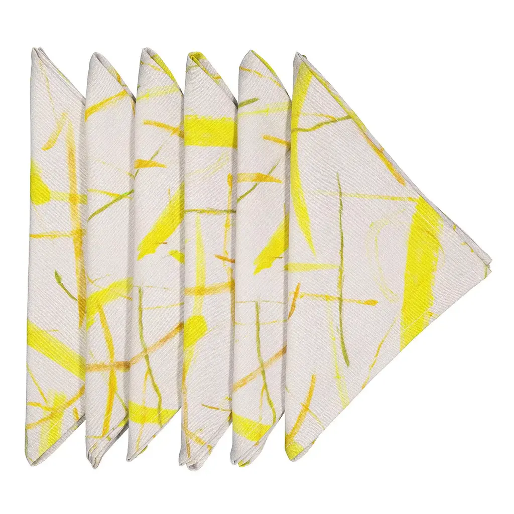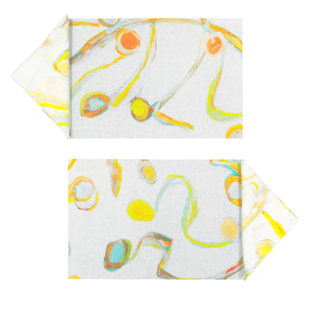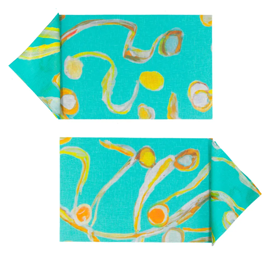 This original Luisa Longo hand-painted artwork has been digitally printed on linen, each piece is cut from a very large motif so all the mats will be different from each other, forming a unique table setting. The fabric has been embedded in an exclusive polyurethane solution with the softest peach skin feel. The placemats have an extraordinary resistance to heat, abrasions, and stains, light and totally flexible, can be washed just with a drop of water and soap.