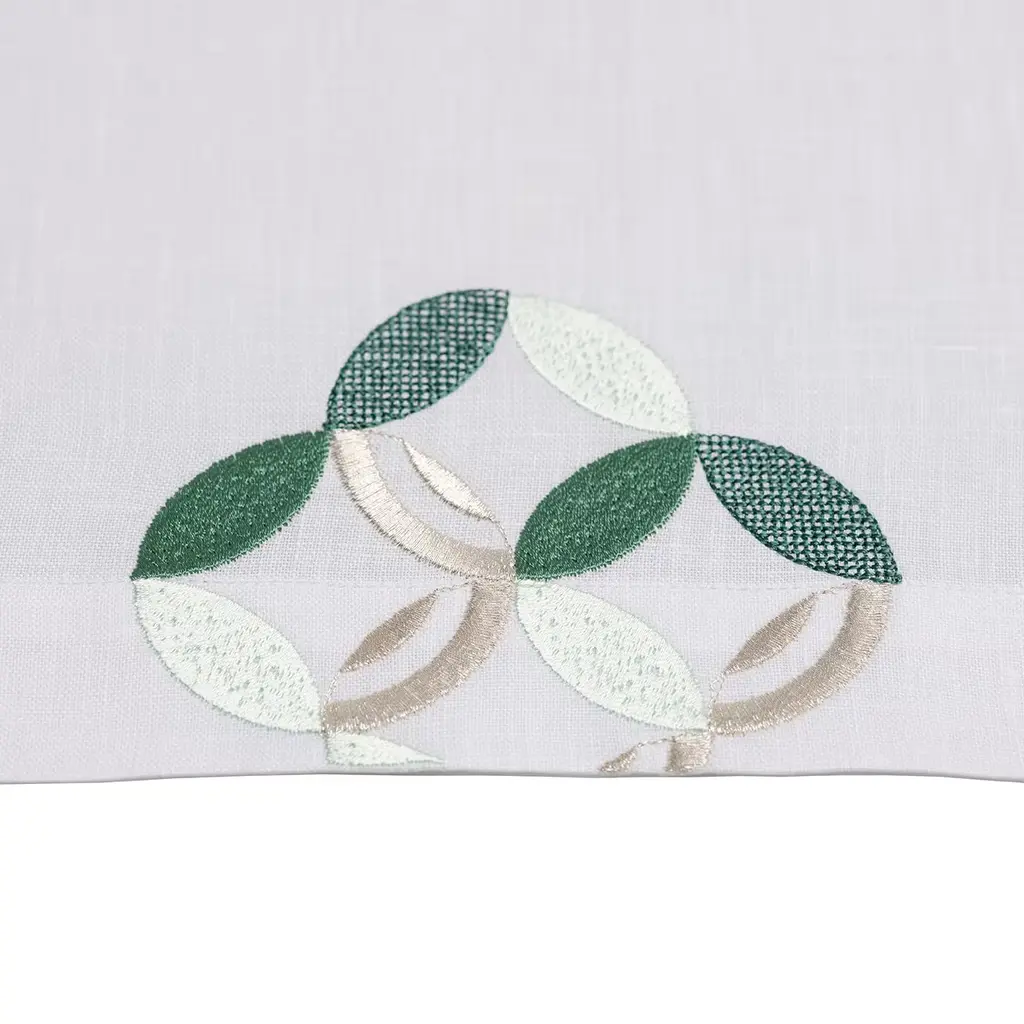 A harmonious blend of traditional craftsmanship and refined contemporary flair, this stunning placemat will make for a timeless addition to an elegantly set dining table. Distinguished by a clean yet sophisticated geometric design, it is handmade of the most precious white linen enriched with four richly-detailed embroideries handcrafted using three different techniques and four colors.