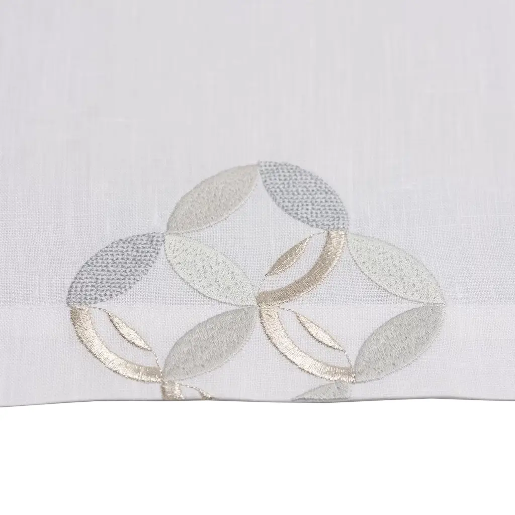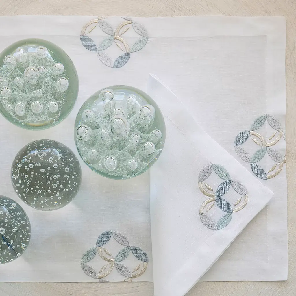 A testament to Italian savoir-faire, this stupendous set of two placemats will add elegance and refinement to a romantic dinner of two. Handmade of the most precious white linen, both pieces are enriched with four richly-detailed embroideries handcrafted using three techniques and four shades of gray and white.