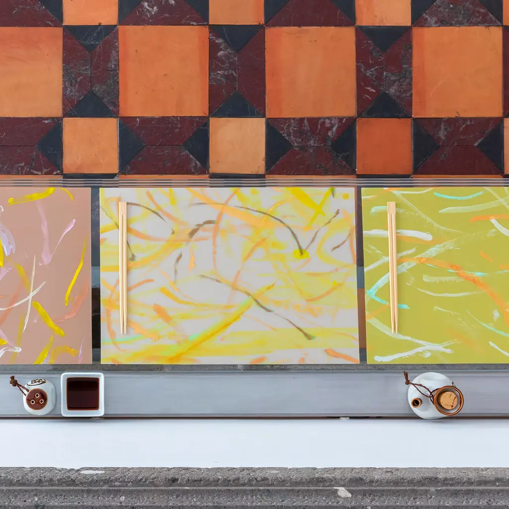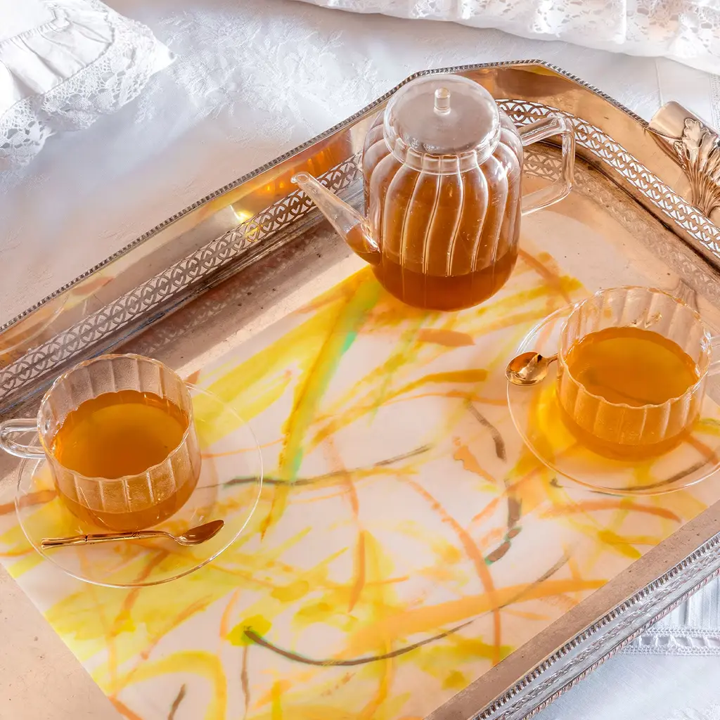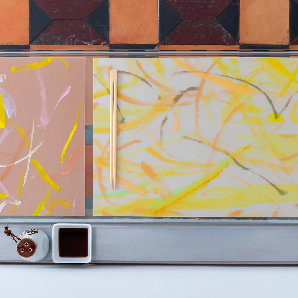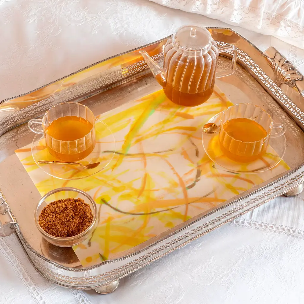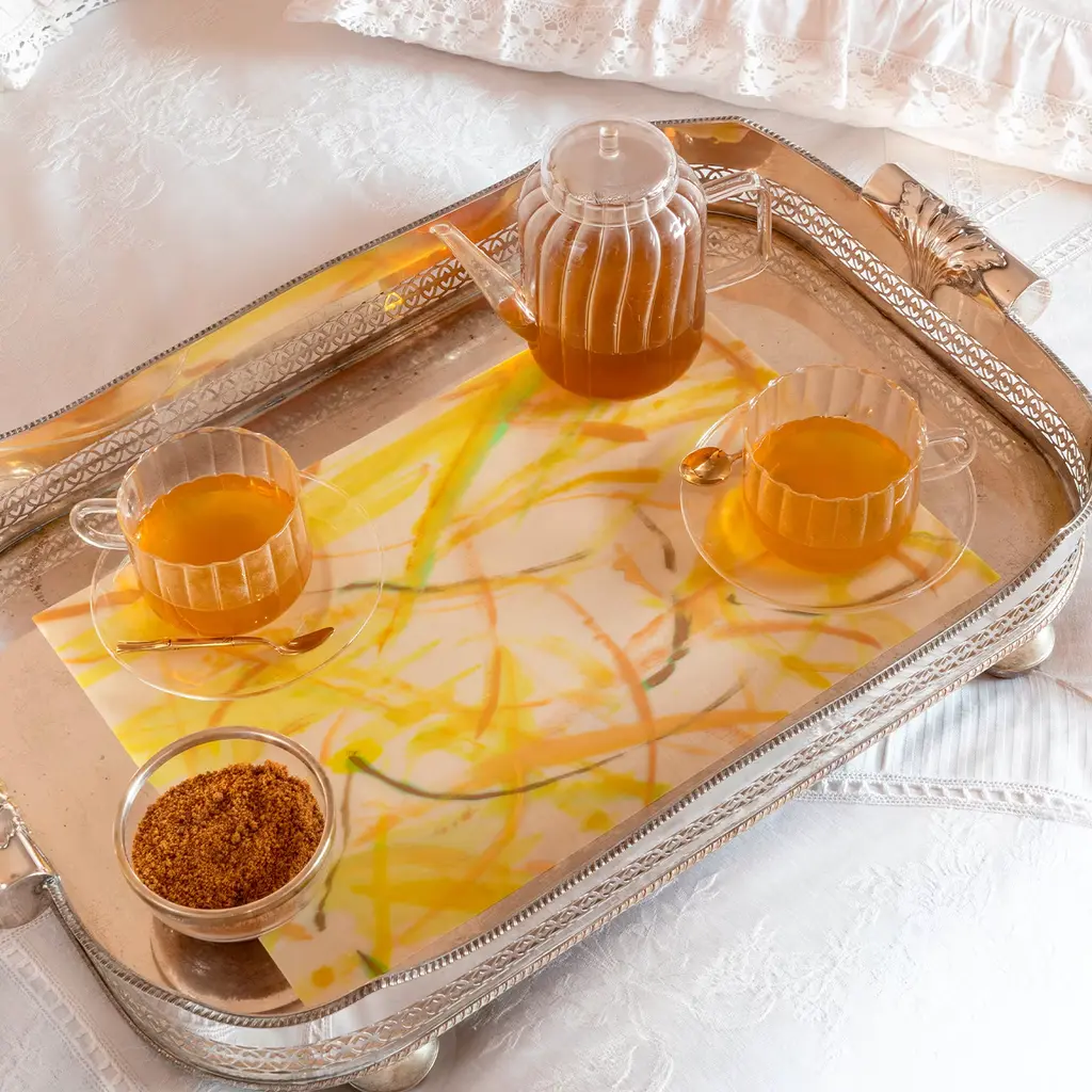 Luisa Longo's precious original artwork, hand-painted on silk organza in mixed, metallic and iridescent colors, is embedded in a unique polyurethane solution with the softest peach-skin feel. The placemats have extraordinary resistance to heat, abrasion and stains, are lightweight and totally flexible, and can be washed simply with a drop of soap and water. The silk organza base gives an even softer feel to the touch, and the artist's brush effects and color expertise are brought to great prominence. The napkins are made of 100% linen.
