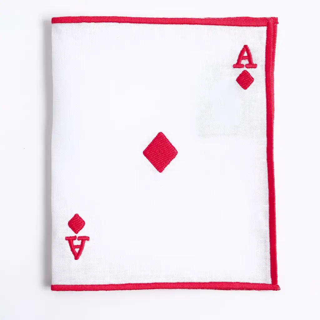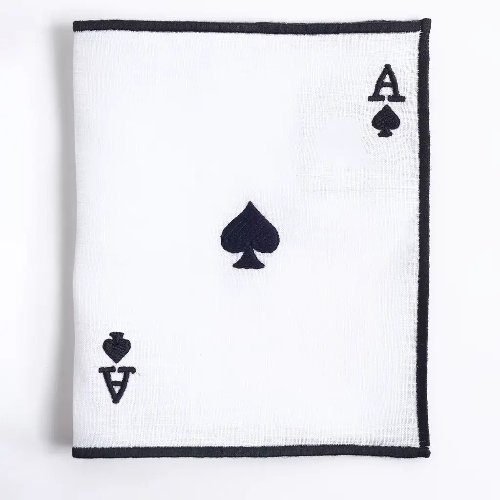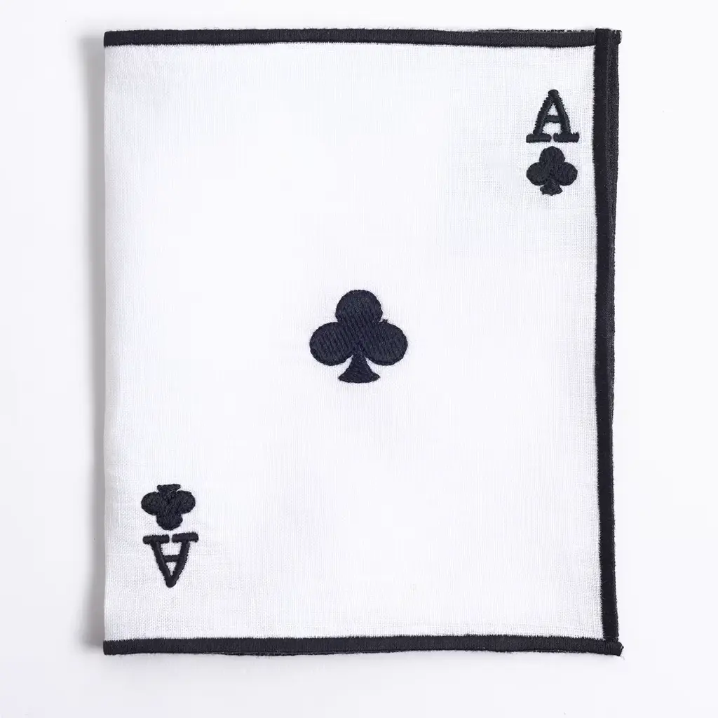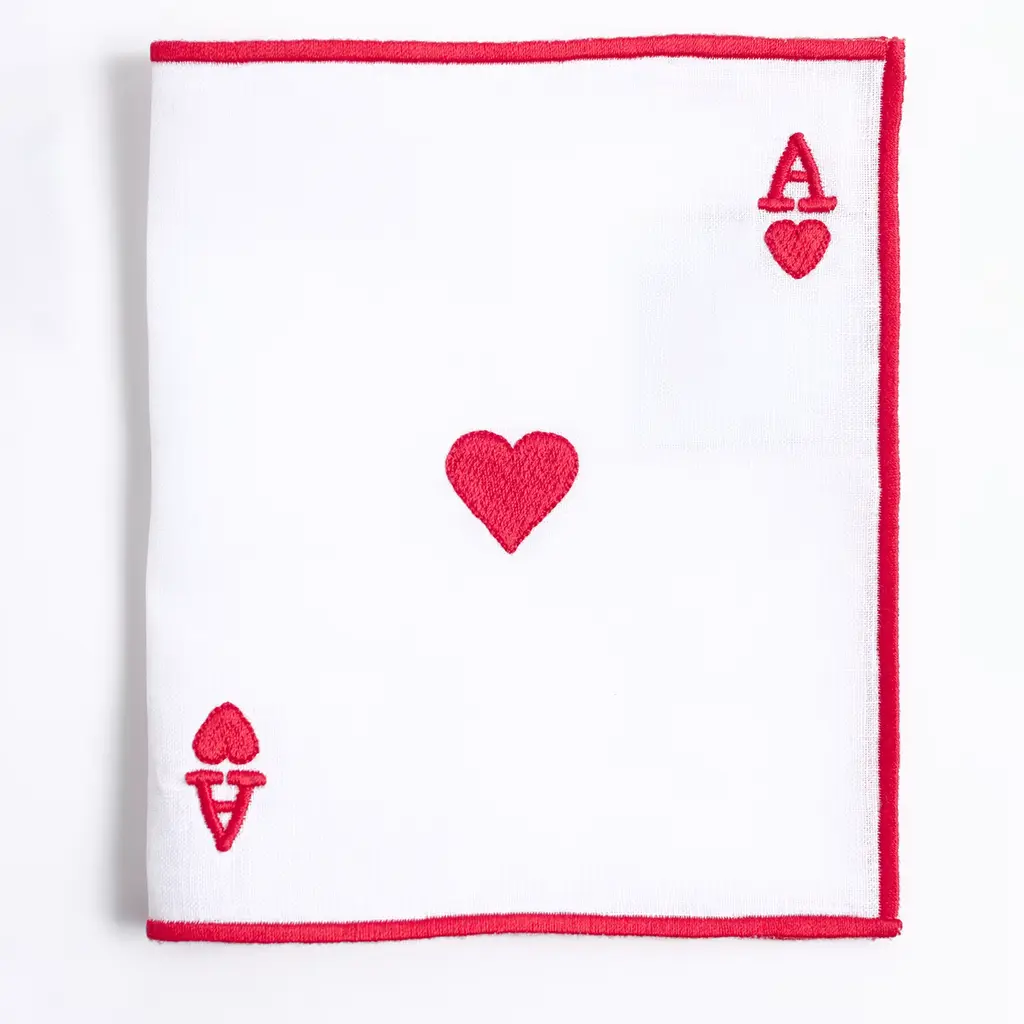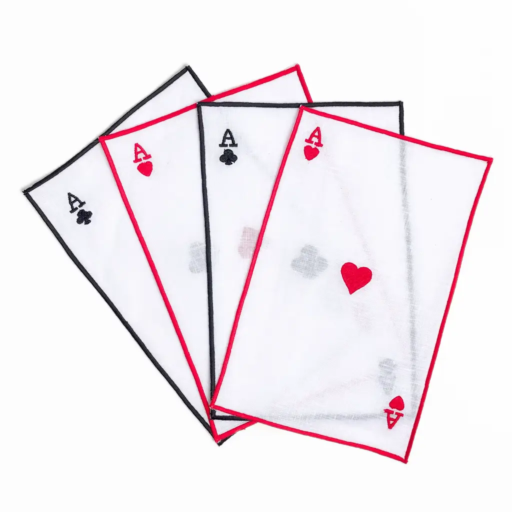 Add a touch of sophistication with the Set of Six Aces Drink Placemats. This unique set includes six rectangular placemats (15x26 cm), each embroidered with details that evoke classic playing cards. The design features striking red and black accents, reminiscent of card suits. Crafted from 100% linen and 100% cotton thread, these placemats combine durability with stylish flair, making them perfect for elegant gatherings.