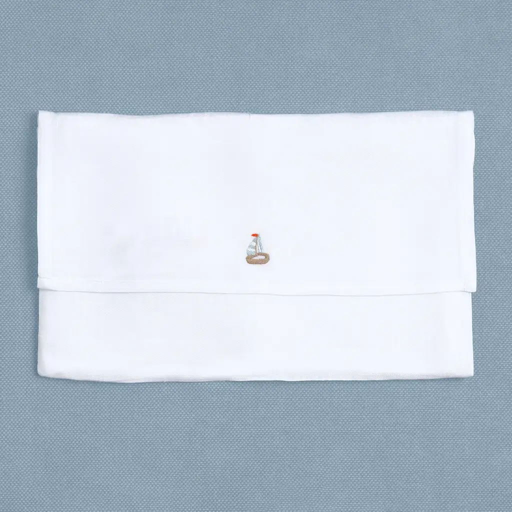 This set of 6 rectangular hand-embroidered drink placemats, with a matching pouch, features intricate sailing ship embroideries on premium Italian linen. Each placemat captures the elegance and adventure of life at sea. Ideal for nautical-themed gatherings or summer soirées, the set showcases Maison Alia's expert craftsmanship and maritime charm. Made from 100% linen with cotton thread, these placemats offer a sophisticated, sea-inspired touch to any occasion.