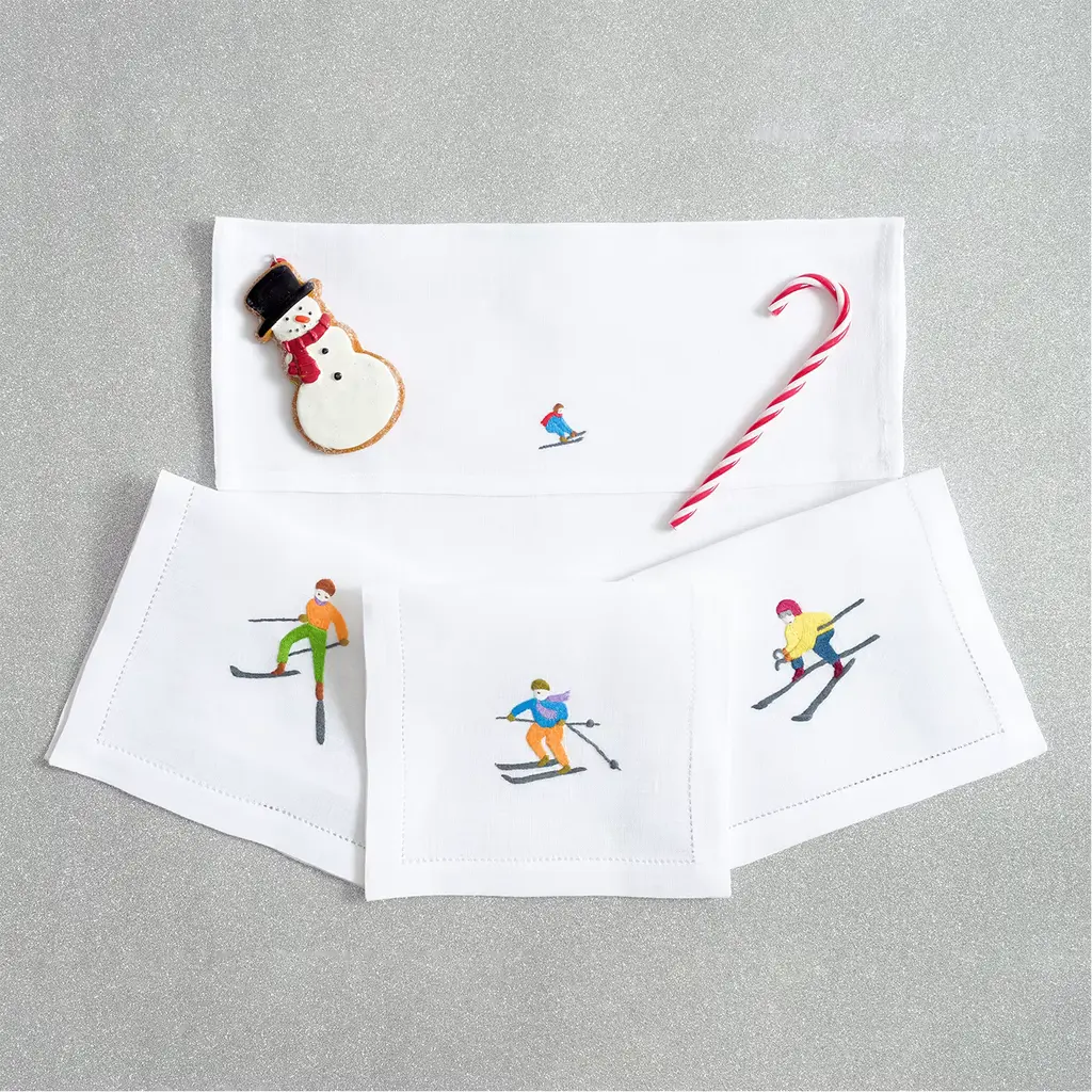 Set Of 6 Skiiers Hand-Embroidered Linen Drink Placemats