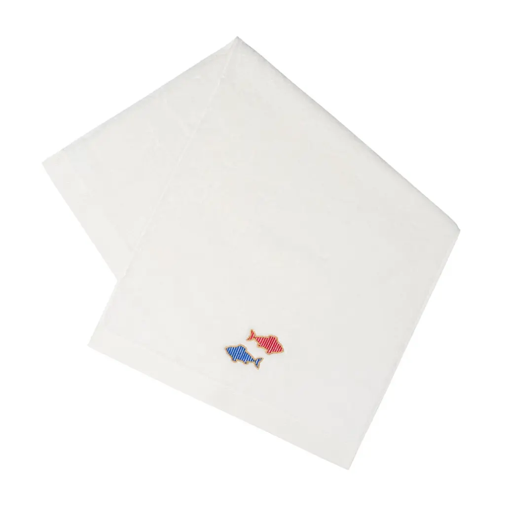Enhance the table with this set of six hand-embroidered drink placemats featuring exotic fish designs. The set includes six rectangular placemats (15x26 cm) and a matching pouch. Each placemat showcases intricate hand-embroidered exotic fish motifs. Made from 100% linen with 100% cotton thread, these placemats offer both elegance and durability. Ideal for adding a touch of artistry to drinks, the set combines functionality with distinctive charm.