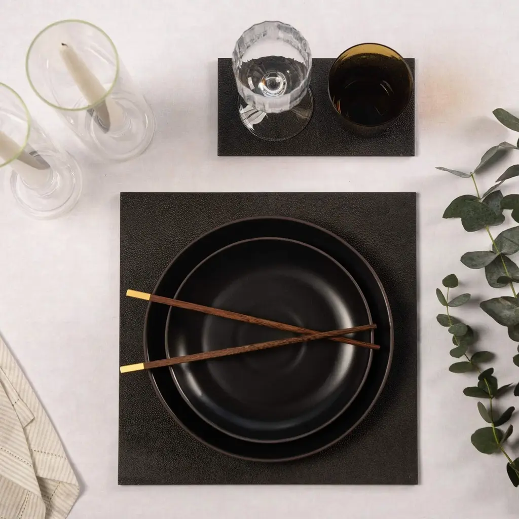 Handcrafted by skilled artisans our signature square placemats in faux shagreen chocolate are a fabulous rich shade of the deepest brown mixed with complementary sub-shades. Through meticulous burnishing and polishing, the natural patina of the material is brought to life making each mat truly unique.We have carefully curated a range which works perfectly when pairing different finishes together to create a unique table setting, there are many playful combinations within the range making it adaptable and fun. Whether choosing classic square placemats or our larger serving mat/grand placemat, we offer unique solutions for ever table setting.Pair with our matching double coaster for the ultimate luxury dining experience.