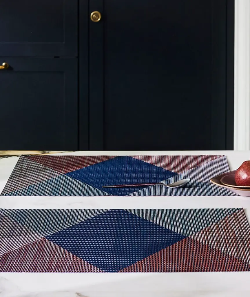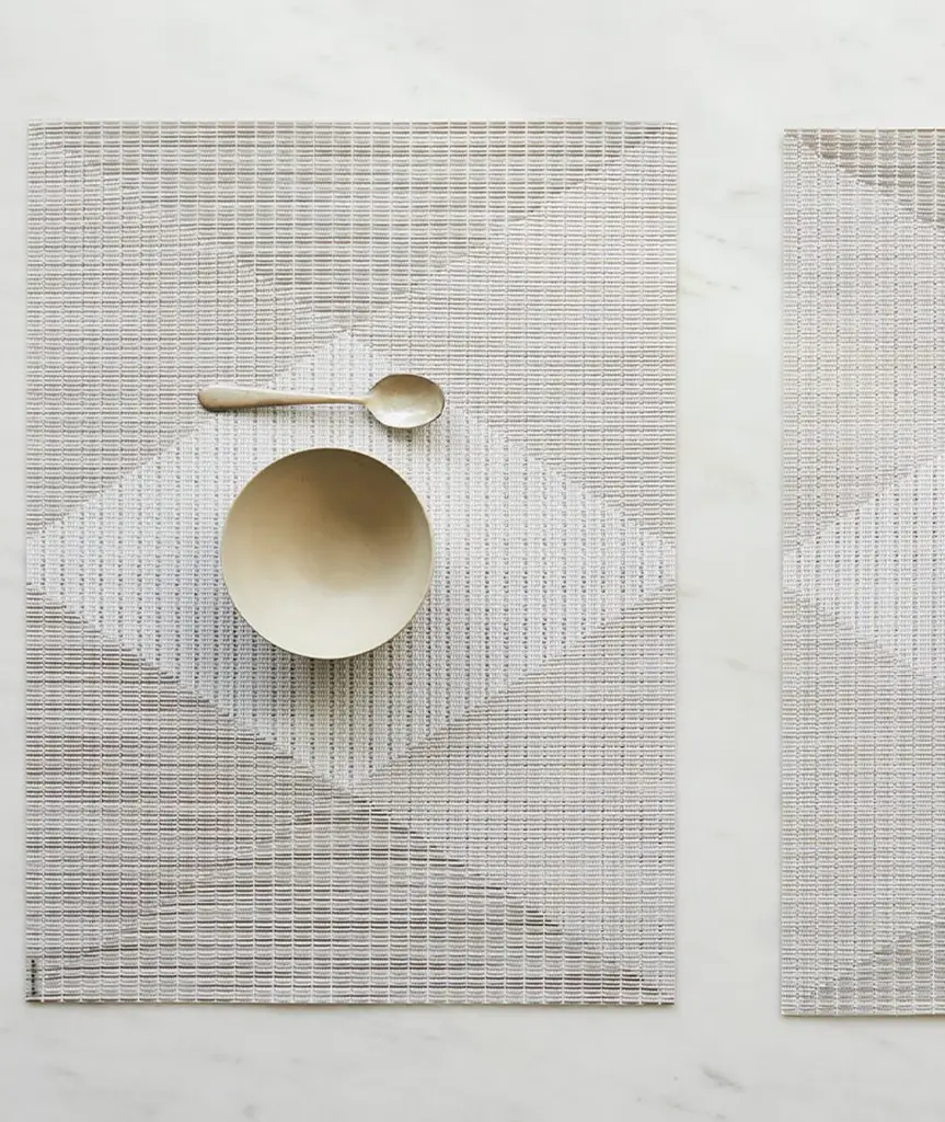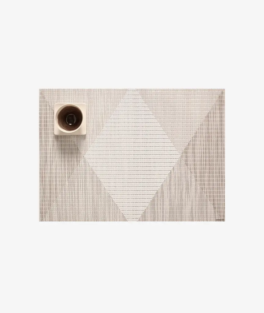 Exploring the interaction of shape, color, and texture, this jacquard weave is especially expansive in scale. Layered forms overlap to create a central diamond surrounded by triangles, making each placemat at once dynamic and refined. For over a decade, New York based designer Sandy Chilewich has been creating original and innovative vinyl products for the home. Her woven, tufted, molded and spun textiles are available in a range of vibrant and neutral hues that have become synonymous with the Chilewich brand name.