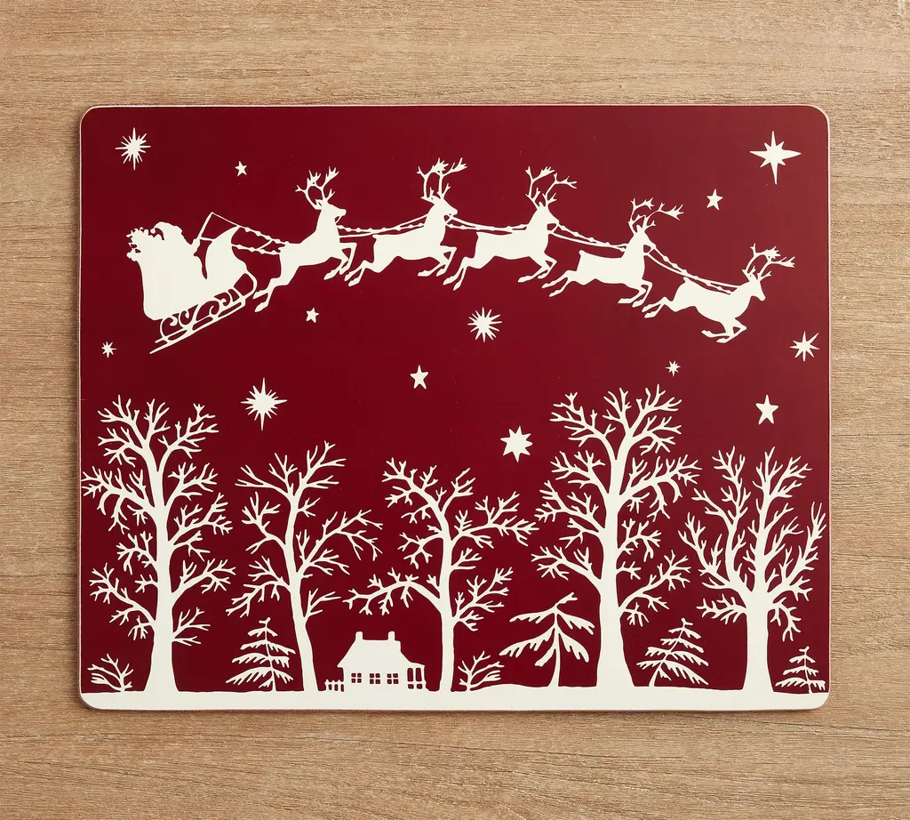 ‘Tis the season for nostalgia so we re-created the simple charm of vintage holiday stationery on this set of four placemats. Silhouette art is naturally crisp, which means more detail without being visually overpowering. And this intricate design of Santa’s sleigh over a secluded cottage has the perfect monochromatic pop of brick red and bright white to contrast your holiday greenery.