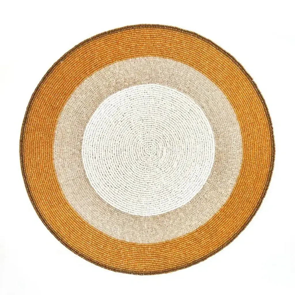 Offered in three confident hues—black, red, and white—these placemats are a sophisticated way to rev up your table. The chic sparkle of petite glass beads, paired with the graphic pop of circular stripes, creates an intriguing dynamic tension. Contrasting bands of metallic beads in gold or silver, add extra dazzle. Pair Sparkle Placemats with coordinating Sparkle Napkin Rings.