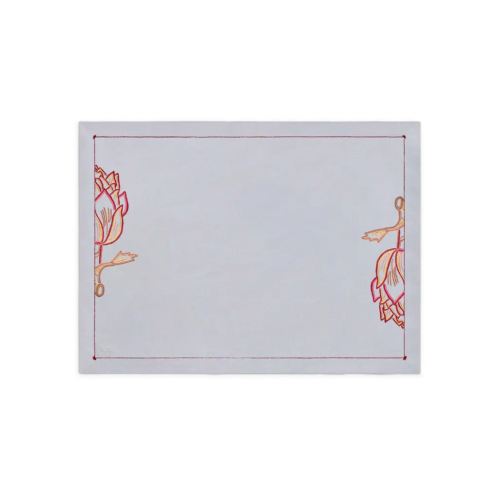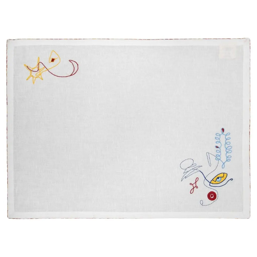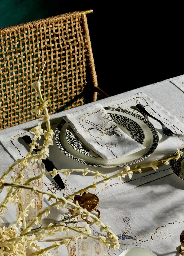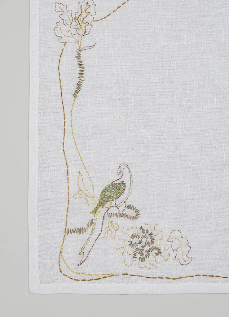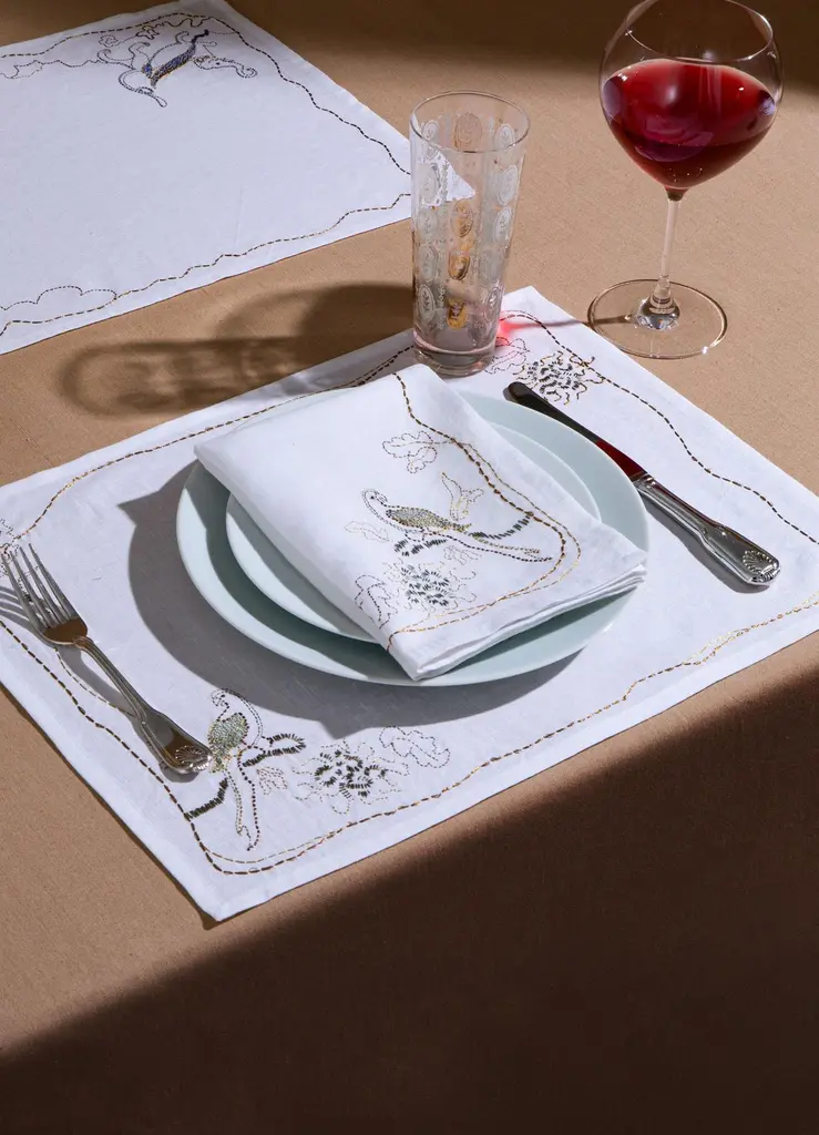 Tree Full of Parrots Hand Embroidered White & Gold PlacematA tree full of parrots is a sign of success in aspirations and future endeavours. According to the 17th century Indian manuscript, “The Book of Dreams”, encountering this avian spectacle in dreams is deemed profoundly fortunate, made more so living amongst the trees of life. Their raucous, throaty squeaks travel far, symbolising blessings and good fortune - qualities we manifested in every hand-embroidered detail of this collection of table linen.Hand embroidered placemat in cotton linen. Handmade in India.Product DetailsMaterial: Cotton LinenSize: 14"W x 19"L 35.6 W x 48.3 L cmWeight: 0.03 0.066 lbsNumber of Pieces: 1 PlacematSKU: VTP501This product has been handcrafted by local artisans. As such, slight variations are a testament to the unique character of a piece made by hand.Country of Origin: India